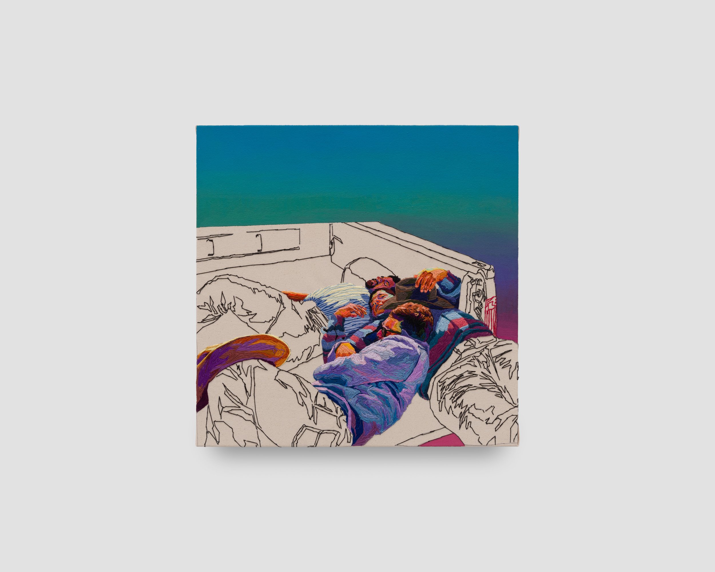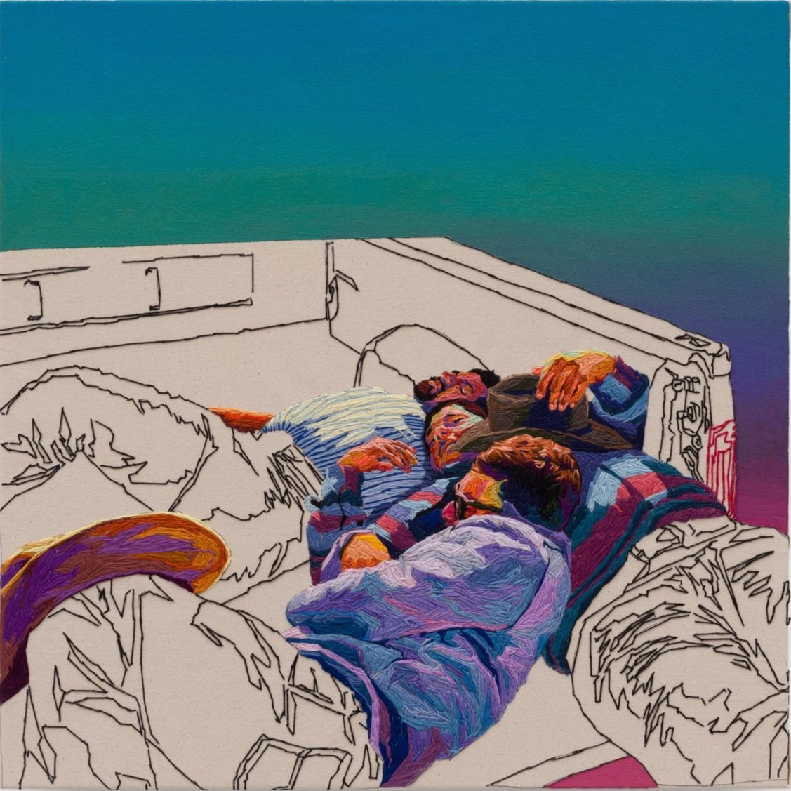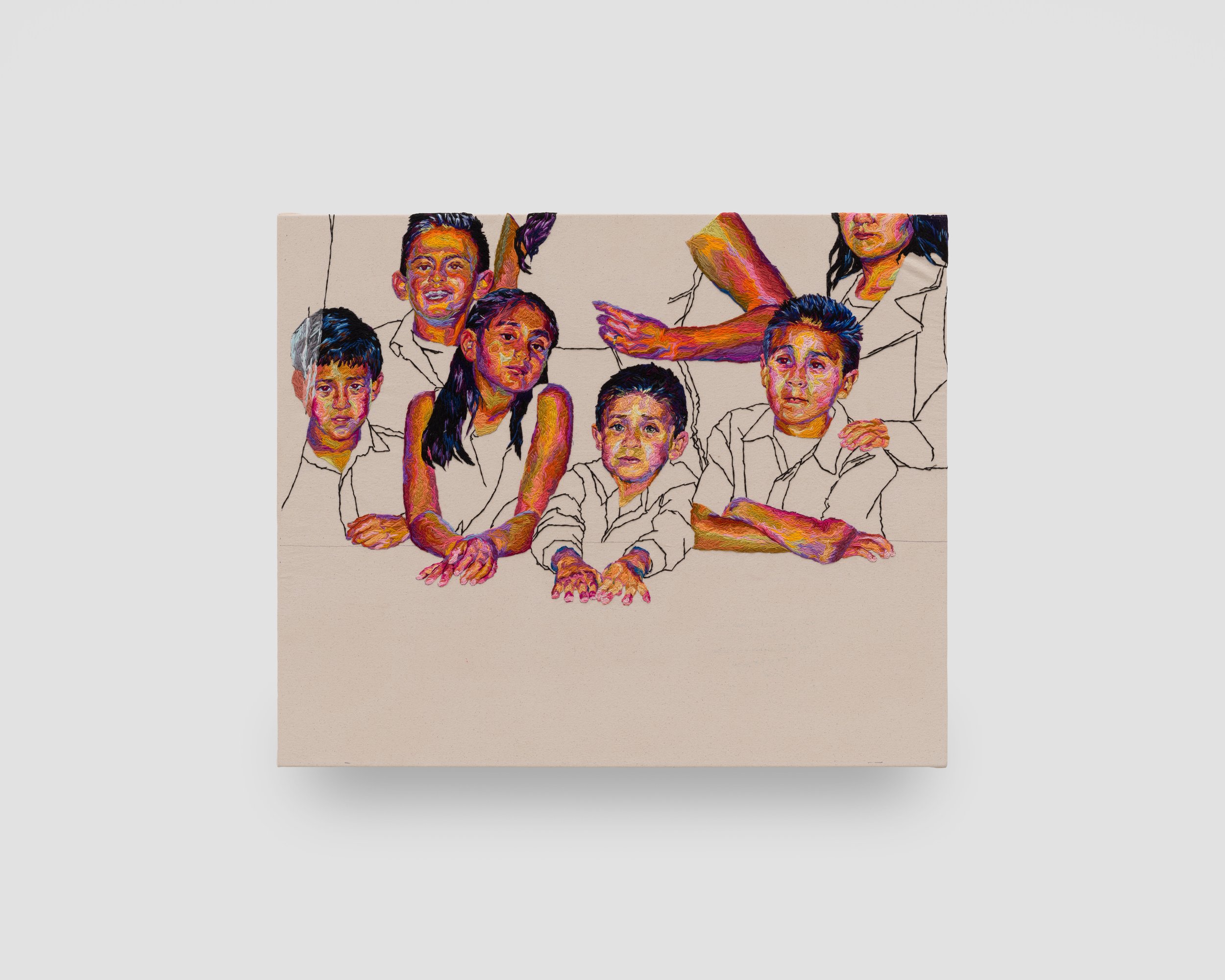 García Hamilton began working with embroidery after the passing of her grandfather, as a way to connect with her own family history. Both grandparents had worked in textiles, but her grandfather was the storyteller of the family. His dedication to craft and to family memory became the foundation for her art practice later in life. García Hamilton is drawn to embroidery’s marriage of evident markmaking and vibrant color, where color is mixed in the eye rather than on the canvas. This allows for an expressionist effect. Perhaps paradoxically, García Hamilton employs embroidery mainly for figures, and especially hands and faces. Her deft use of embroidered color lends her figures an almost inner glow, as if, through these works, we are allowed to see more than just their physical appearance.