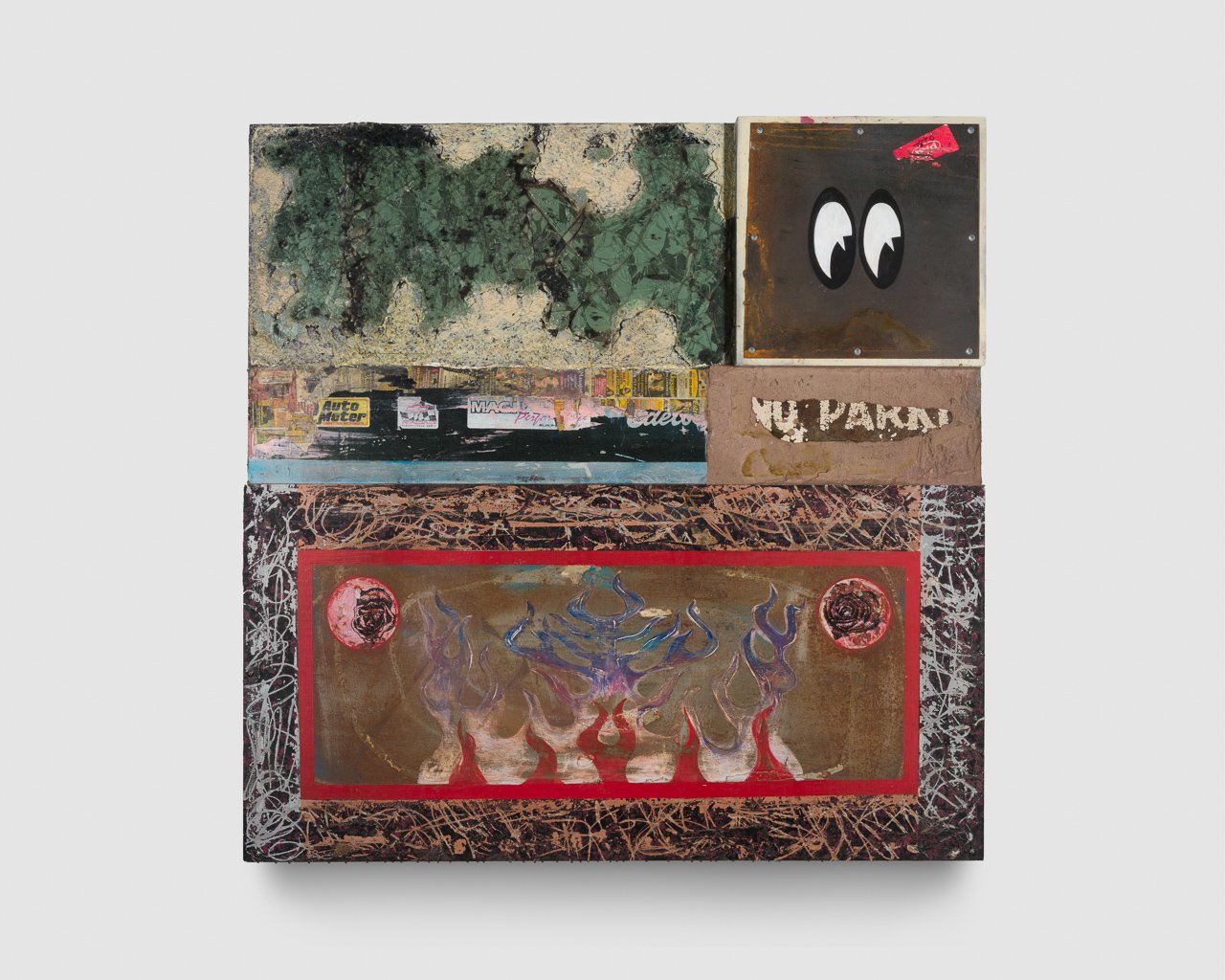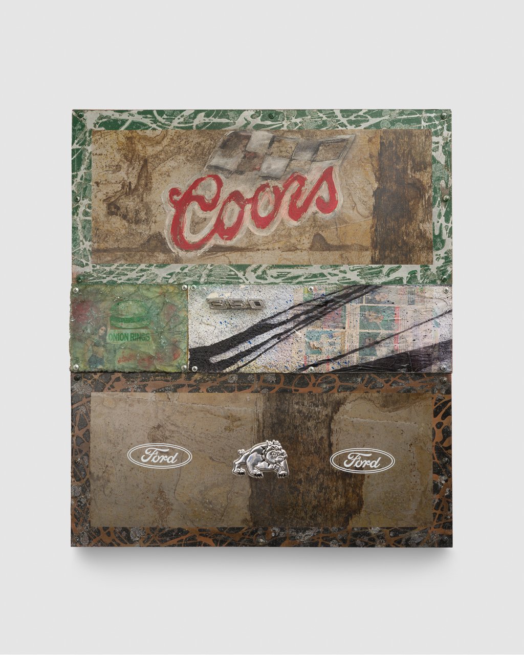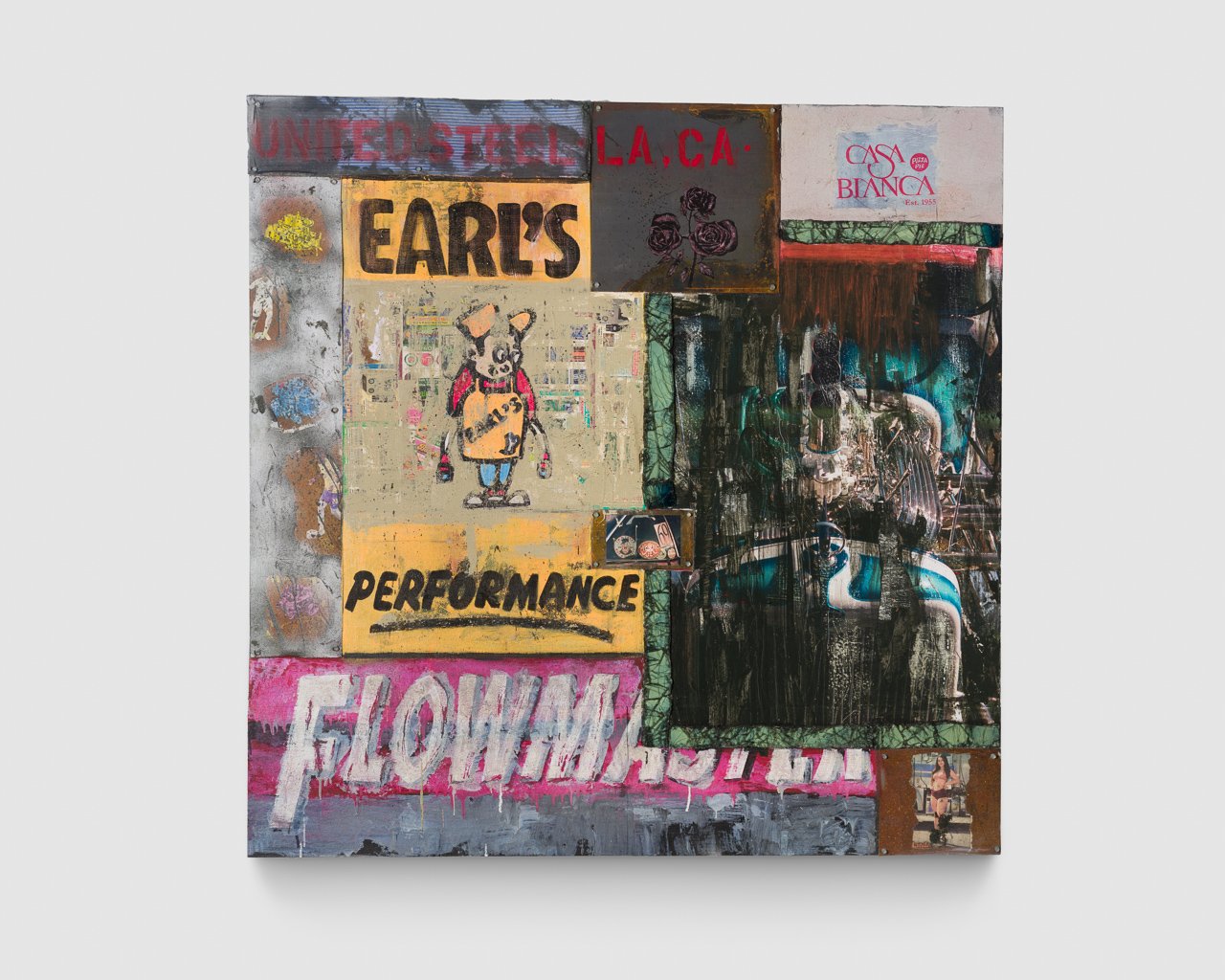 Windshield glass also appears in Sinister Purpose, a composition in three registers that evokes the souped-up grill of a classic hot rod as much as it does the formal experimentations of Mexican painter José Clemente Orozco’s 1930’s abstractions. Peña’s painterly skills come to the fore here. He borrows a niche technique from lowrider finishing that uses dish soap to repel paint, leaving the swirling traces of liquid permanently visible. Peña sands down the entire surface, lending it a lived-in, aged feel. Personal history comes through as well: roses lifted from the signage of the bakery from his childhood neighborhood masquerade as something like headlights in the bottom register, while the cartoonish logo of the Moon Eyes hot rod fabrication shop peer down from the top. This famous outfit was known for speed in its midcentury heyday, and was located near Peña’s father’s shop in Santa Fe Springs.
