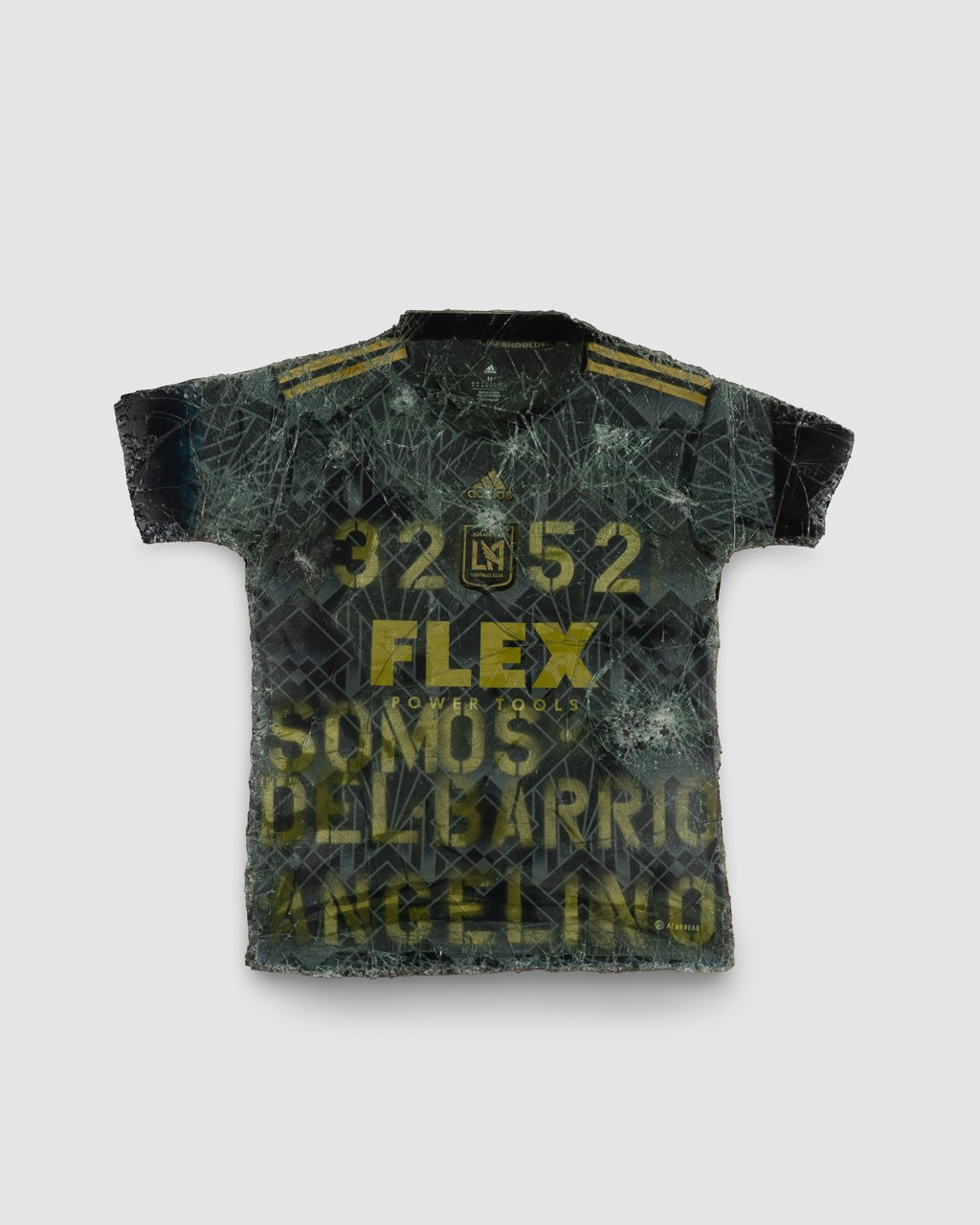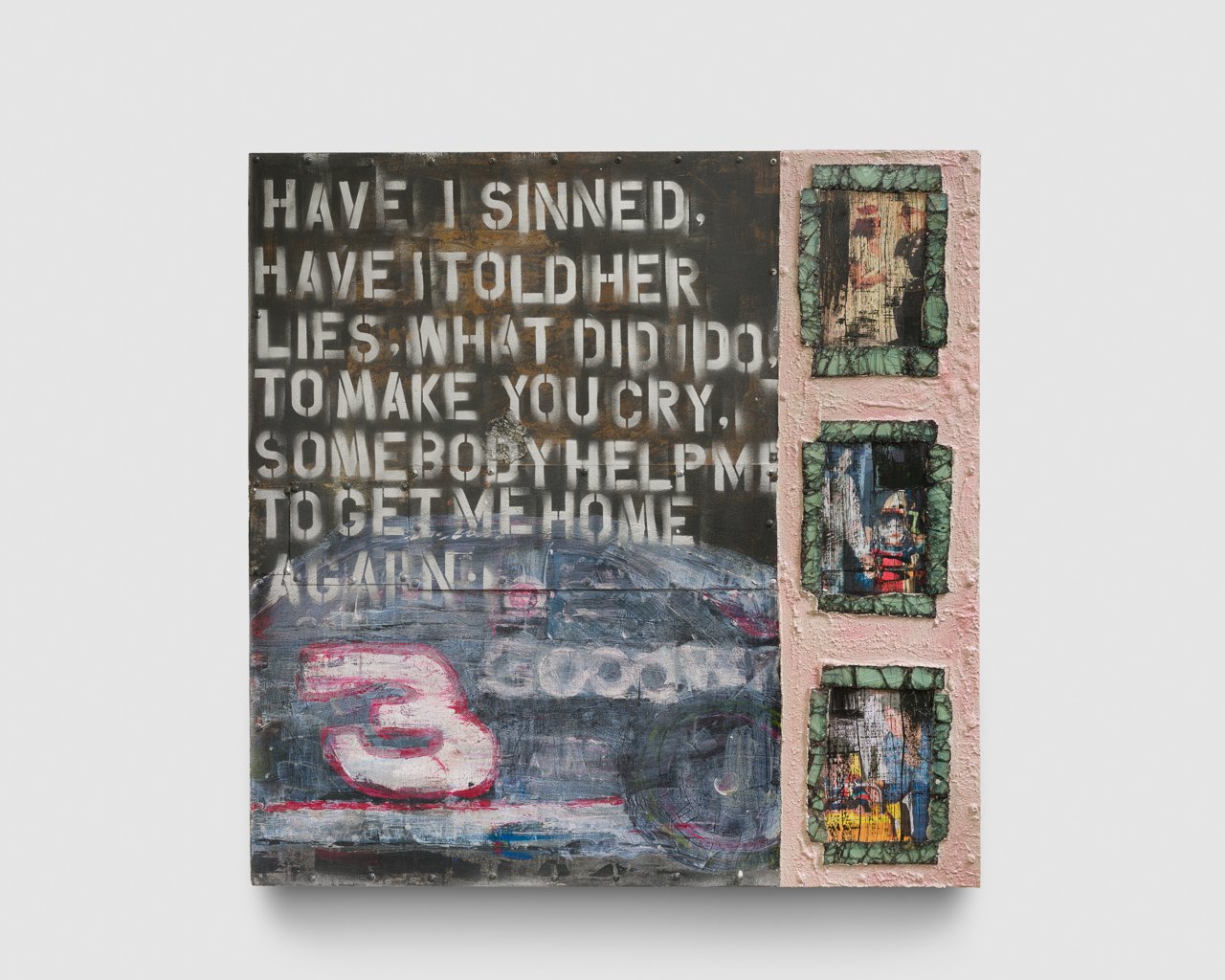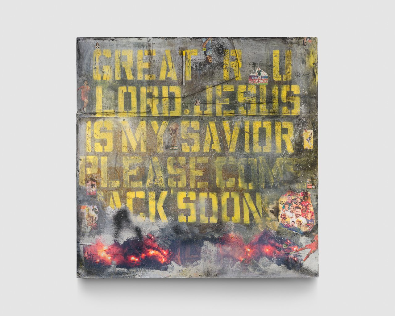 Cars are a throughline in Peña’s work, made manifest not only in the accoutrement of auto body shops and collaged photographs, but also in more material ways. The surface of Welcome to Chavez Ravine is seen almost entirely through the spidering cracks of a busted windshield, a discarded remnant of vehicular violence or mishap that can often be found littering the streets of Los Angeles. The cracked glass comes close to obliterating the image behind it, but the interlocking letters of the Dodgers logo loom large, and the artist’s own Dodger hat is affixed at the bottom right of the composition. Peña sees this work as a kind of ofrenda to fanhood, a devotional space that honors a favored team and its deep roots in the city. This commingling of sports and religious fervor is made even more apparent in Catholic Guilt and Footie Fever, which includes a stenciled prayer over images of soccer heroes and rioting soccer fans.