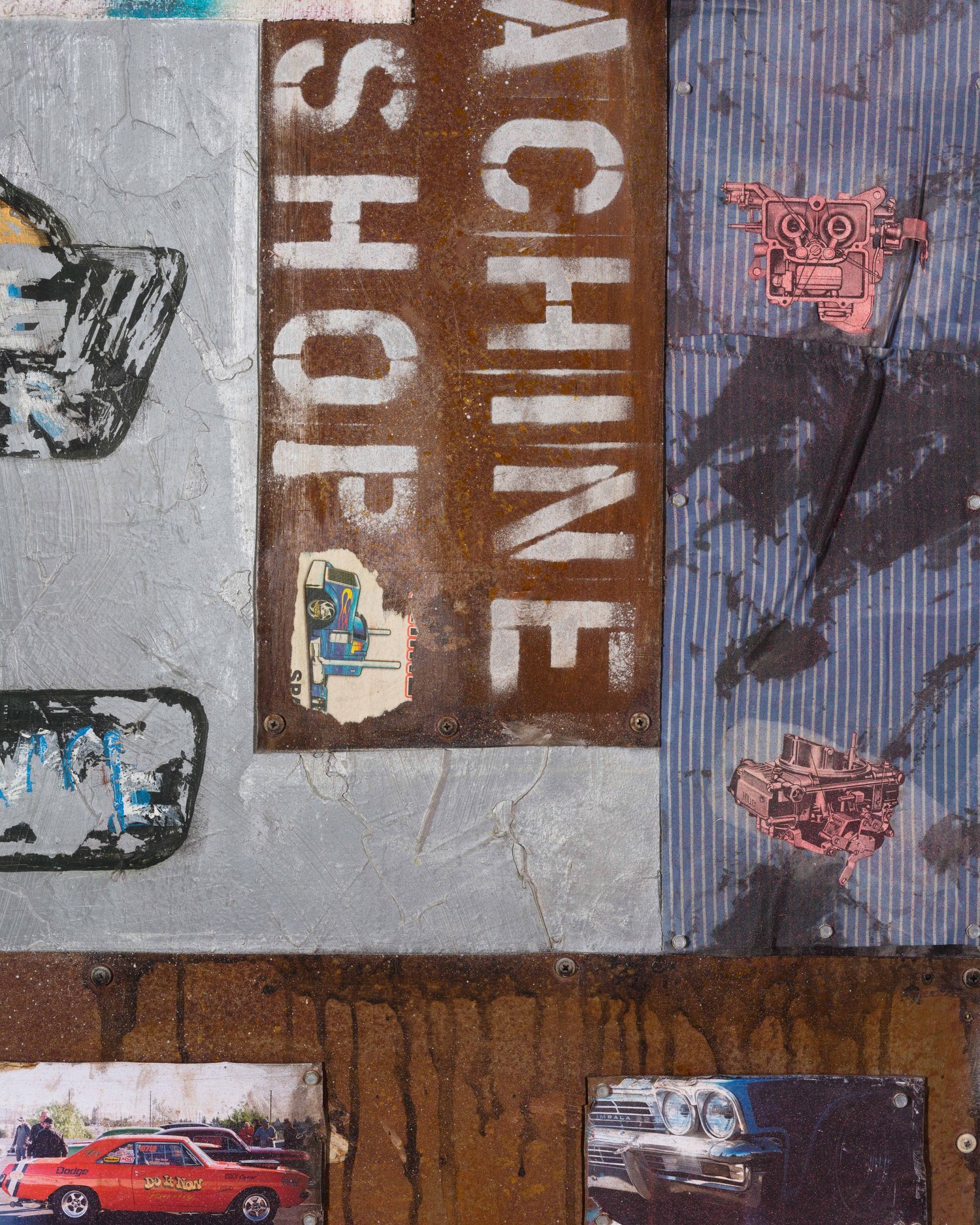 The opposing forces of assimilation and tradition create a central tension in Peña’s work. Growing up, his father embraced the Americanness of hot rods and sports teams, while his mother sought to strengthen the family’s Mexican roots. Works often incorporate elements that nod to both points of view. The Bear Will Take Care of You imagines a fantastical auto body shop, with the famous happy bear sign welcoming the viewer into the space and collaged pictures of vintage cars along the bottom edge. Each of Peña’s works contains some element of metal support, an ode to his father’s work as a machinist. Here Peña transforms the striped fabric of a typical mechanic’s shirt into a collage element, where it becomes an underlying overall pattern. Roses and text from a Mexican bakery bag dot the composition, undermining the machismo of the mechanic’s gear. Pulled between two poles and left feeling out of place in both worlds, Peña developed a fascination with Americanness as a concept and an identity, one he aims to tease apart in his work.