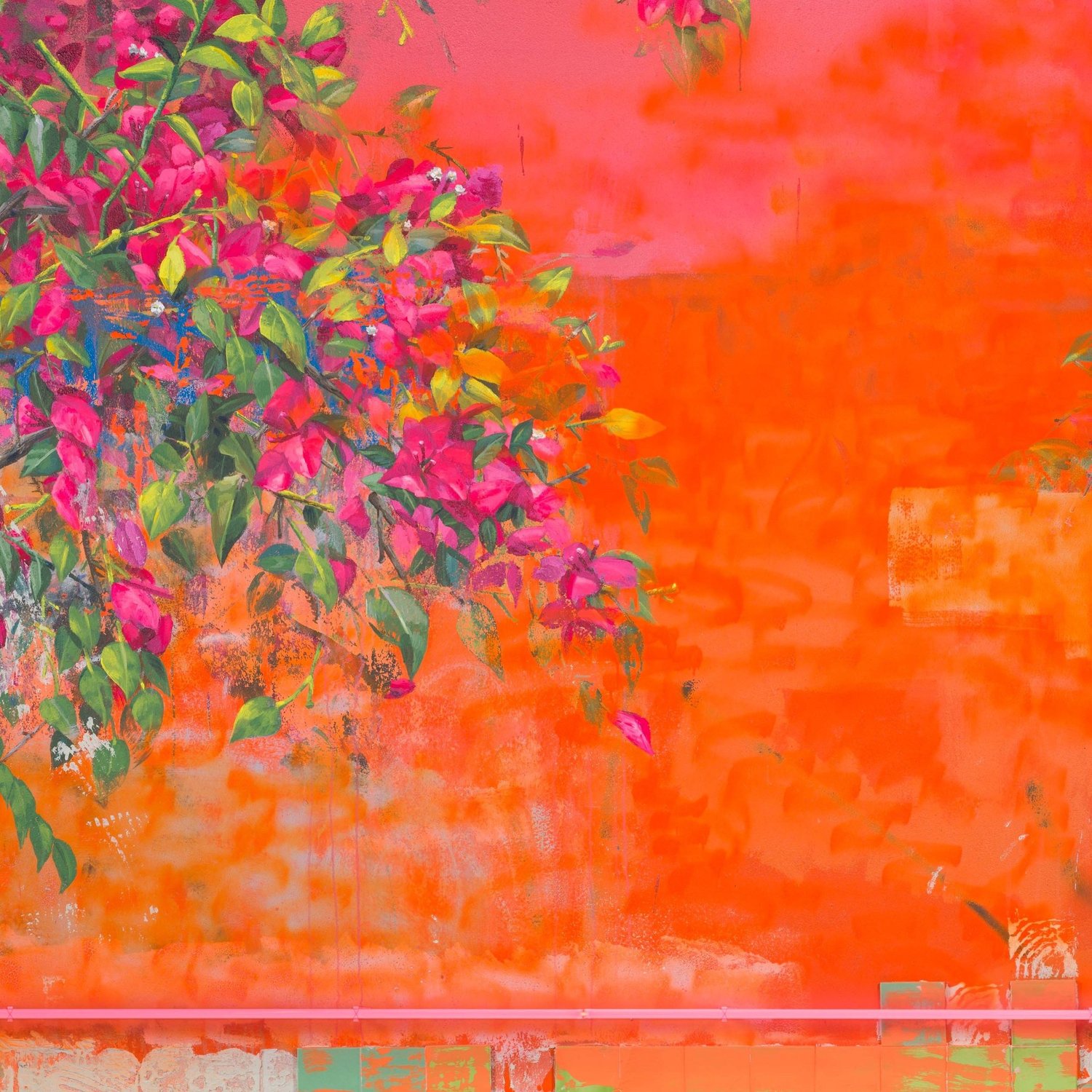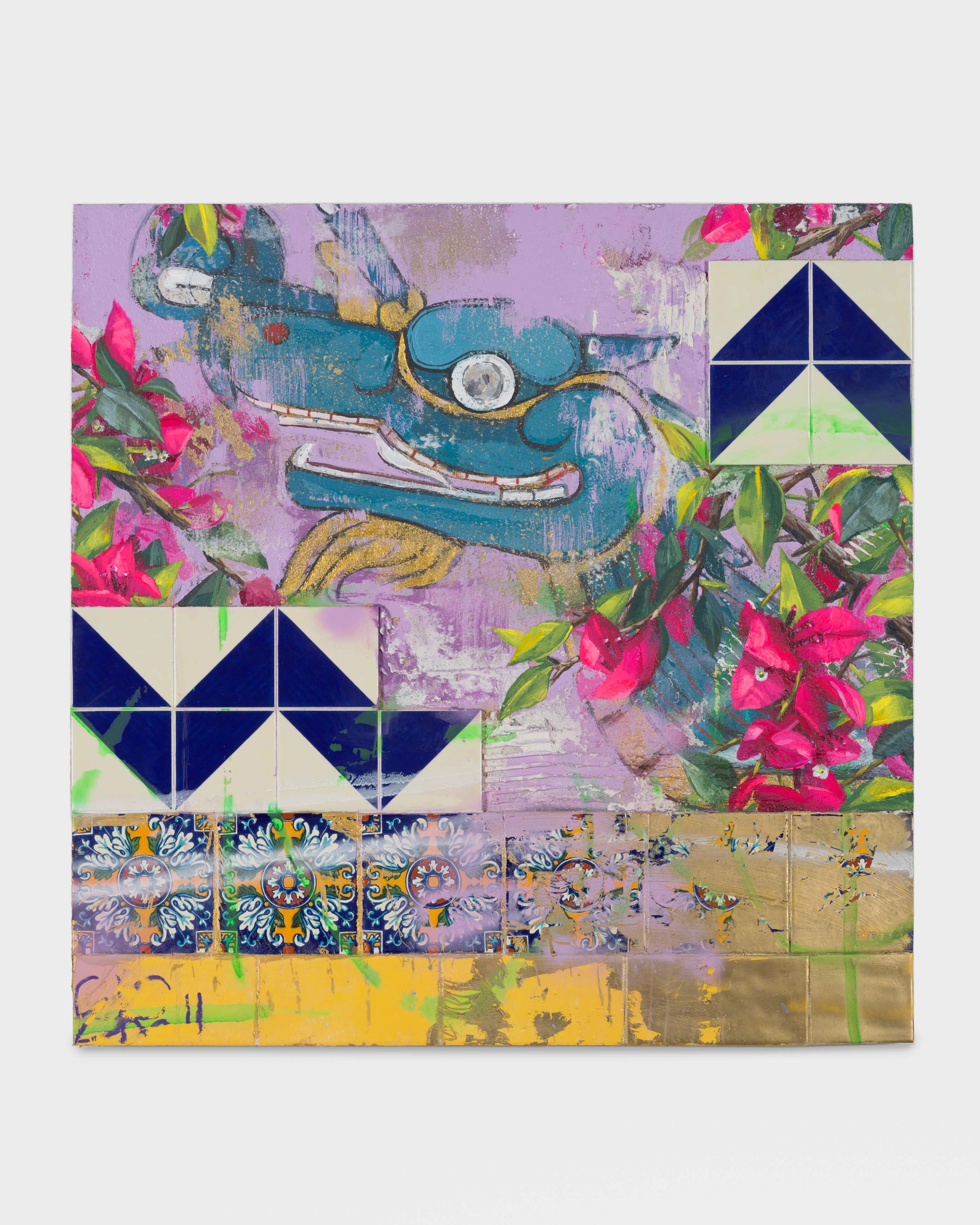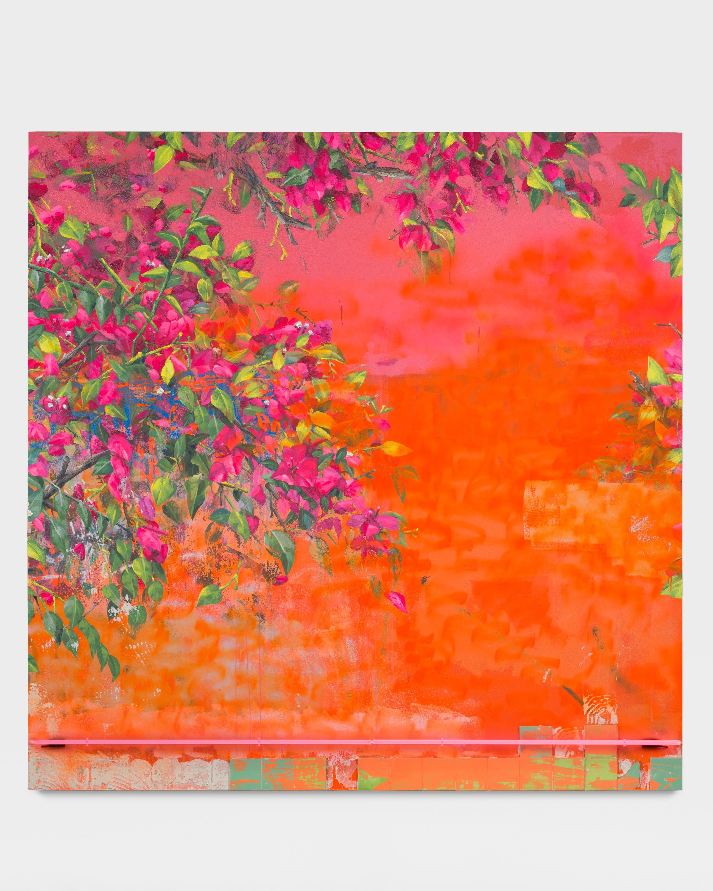 Patrick Martinez is at the vanguard of a movement of BIPOC artists making mixed media paintings in response to their lived environment(s) around East and South Central Los Angeles and San Gabriel Valley. Typical in Patrick’s neighborhood are corner stores adorned with murals of various kinds, many containing references to Nahua or Maya mythological forms. Also common are security bars and home-based businesses featuring neon signage addressing motorists and passerby from available windows. Operating in a manner similar to collage, Patrick’s landscape works locate viewers in a particular geographic place with a demonstrable ethnic identity and socio-economic position. These paintings are executed on wood panel and are painted and assembled in layers. There are several layers of clear figuration, each of which is painted over with house paint once complete. Patrick then uses a pressure washer to blast away the house paint, exposing the under-layers of figuration, resulting in the visual suggestion of aging, erosion, and the passage of time. The foundational layers of figuration will frequently display evidence of aerosol paint tags, with subsequent buffs of those tags which are later tagged again, imparting a sense of narrative to the places evoked in the paintings. Atop these multi-layered surfaces Patrick adds neon forms, signature ceramic elements, and found materials such as security bars and tarp signage to complete the compositions. The results are abstracted landscapes that evoke sites in Patrick’s community and their respective timelines - the viewer sees the decades of wear in each surface and feels the vulnerability of each place to change and possible displacement.