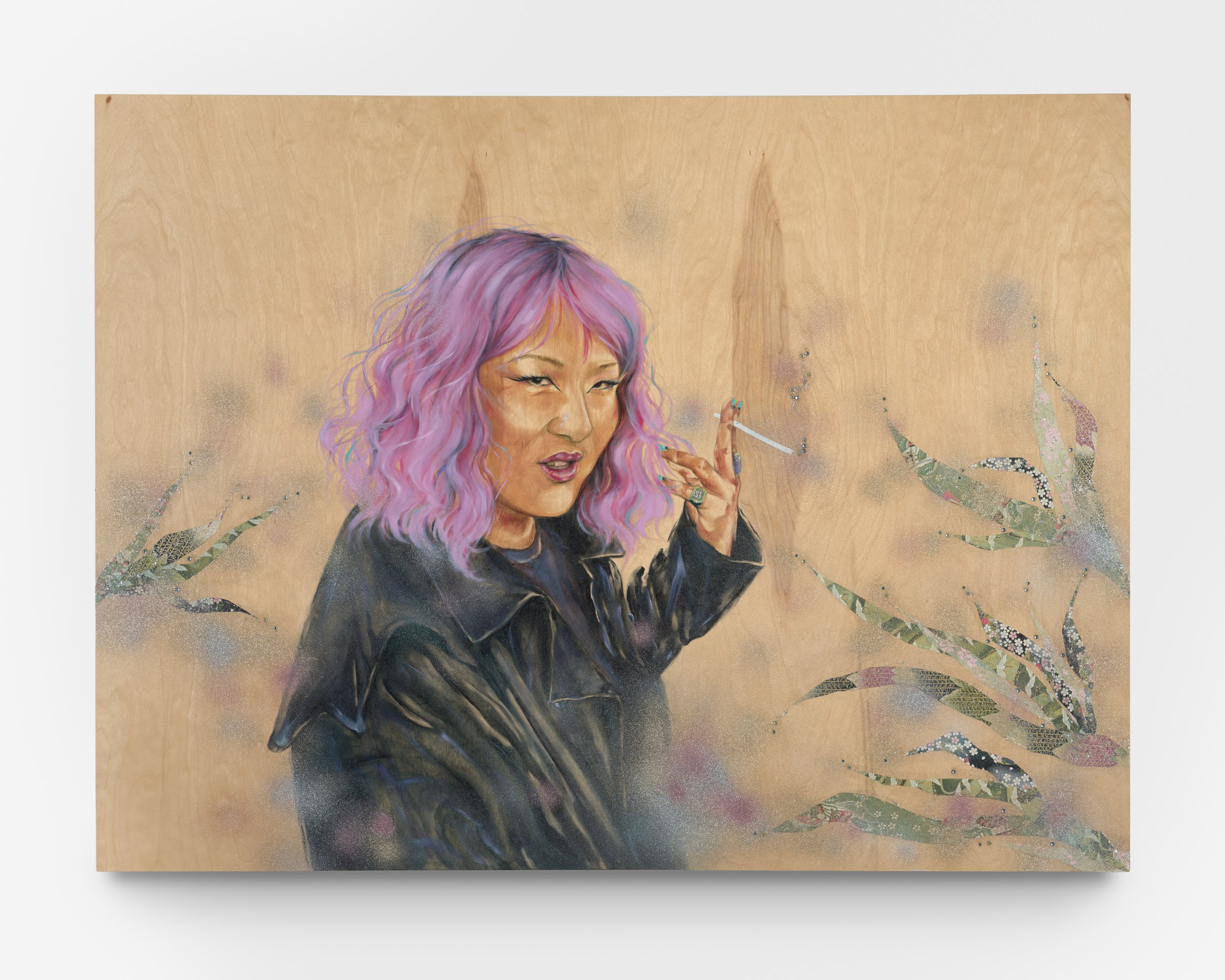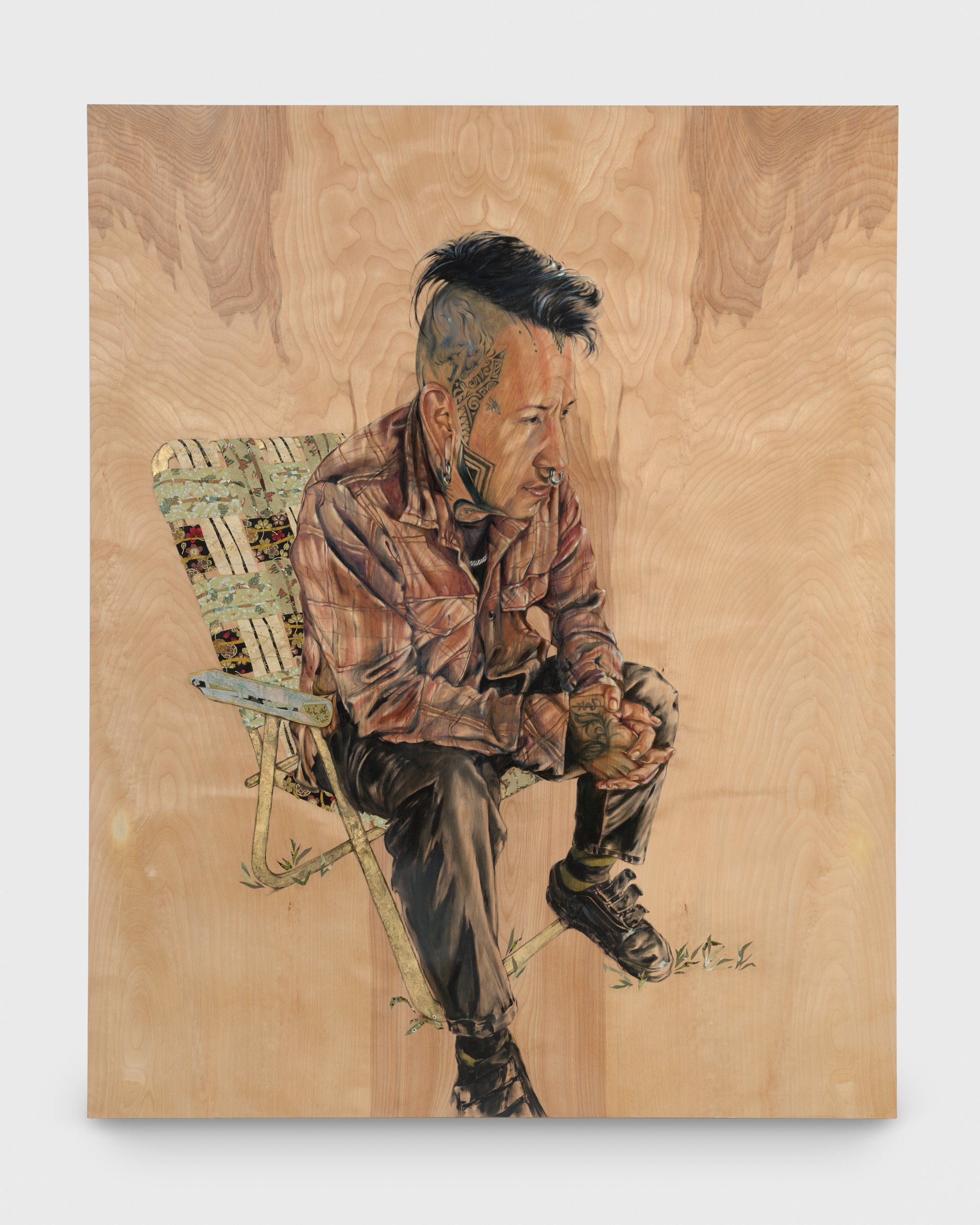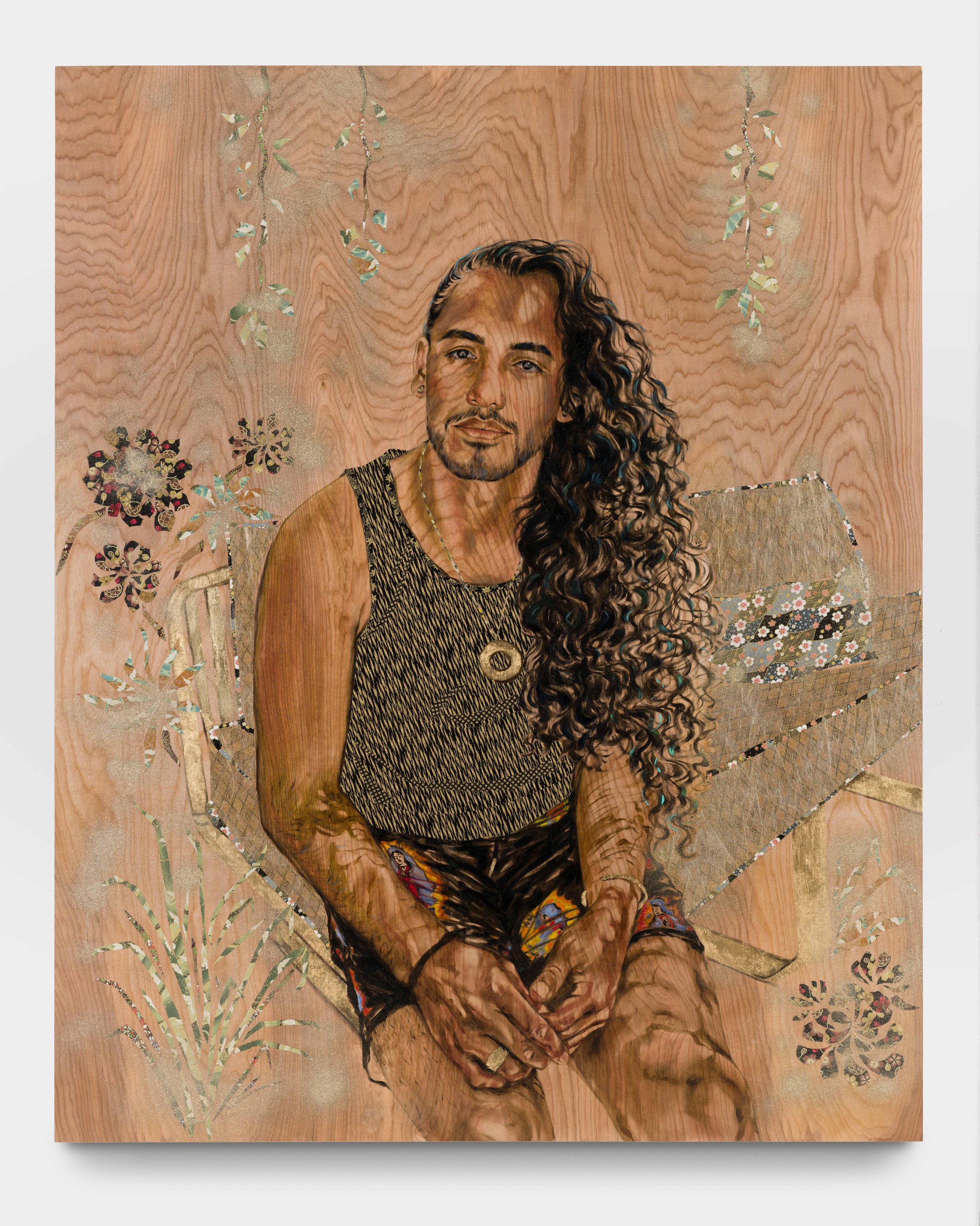 “I do portraits celebrating people, friends and peers, many of whom are activists, brown, queer, trans, Indigenous, immigrants, femme and the like, who exist regardless of legislation and historical erasure. The detailed, yet minimal portraits are homage to people in my circles who I’ve come to admire for varying reasons. I use bare wood panels as a ready-made backdrop while also referencing the scrap wood sculptures my grandfather would make when he was incarcerated in the Japanese American prison camps during WWII. The wood panels allow the portraits to become sculptural and the transparency of the oil paint allows the wood grain to show through in order to acknowledge a more ephemeral, and fluid subject-hood. The floral works are born out of communal crafting done in the Japanese American Incarceration camps during WWII and are based off of paper rose patterns found in the archives of the Manzanar prison camp. To acknowledge and pay respects to those who have endured through incarceration, colonization, pandemics, genocides, I offer the floral works as a pause for reflection and space for communal mourning. The historical roots of which were inspired out of communal crafting that families would make while imprisoned. They are made from traditional Japanese washi papers, floral ribbon, found chain-link fence parts, and gardening trellises.”
