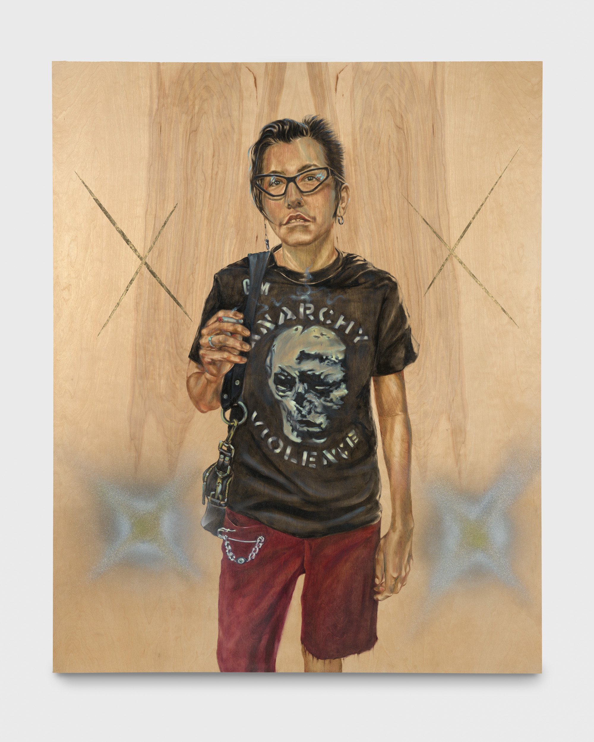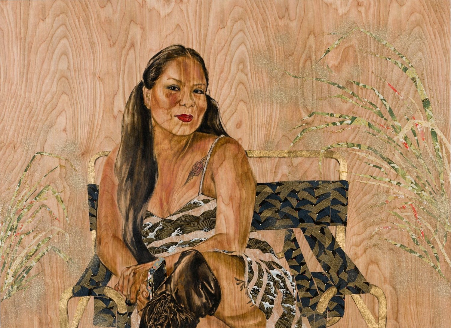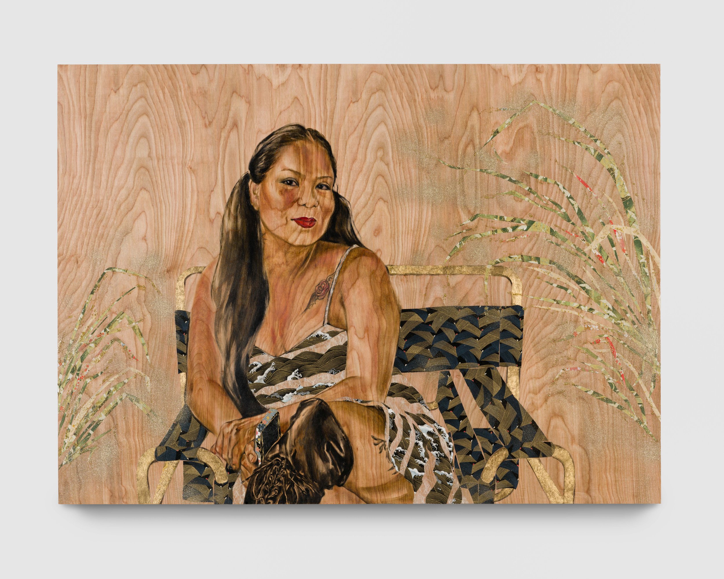 “I do portraits celebrating people, friends and peers, many of whom are activists, brown, queer, trans, Indigenous, immigrants, femme and the like, who exist regardless of legislation and historical erasure. The detailed, yet minimal portraits are homage to people in my circles who I’ve come to admire for varying reasons. I use bare wood panels as a ready-made backdrop while also referencing the scrap wood sculptures my grandfather would make when he was incarcerated in the Japanese American prison camps during WWII. The wood panels allow the portraits to become sculptural and the transparency of the oil paint allows the wood grain to show through in order to acknowledge a more ephemeral, and fluid subject-hood. The floral works are born out of communal crafting done in the Japanese American Incarceration camps during WWII and are based off of paper rose patterns found in the archives of the Manzanar prison camp. To acknowledge and pay respects to those who have endured through incarceration, colonization, pandemics, genocides, I offer the floral works as a pause for reflection and space for communal mourning. The historical roots of which were inspired out of communal crafting that families would make while imprisoned. They are made from traditional Japanese washi papers, floral ribbon, found chain-link fence parts, and gardening trellises.”