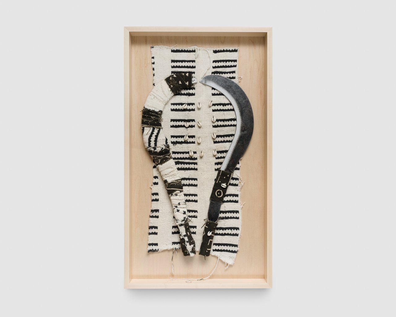 Cullors’ artistic practice, which is in part inspired by Los Angeles’ Black Arts Movement of the 1960s and 1970s, invites the use of artworks as spiritual guardians, creating a legacy of creative offerings that exist beyond the visual plane and become both urgent cultural commentary and spiritual armor. To this end, Cullors has dedicated each piece in Between the Warp and Weft to a different Black woman in her life to whom she wants to extend protection.