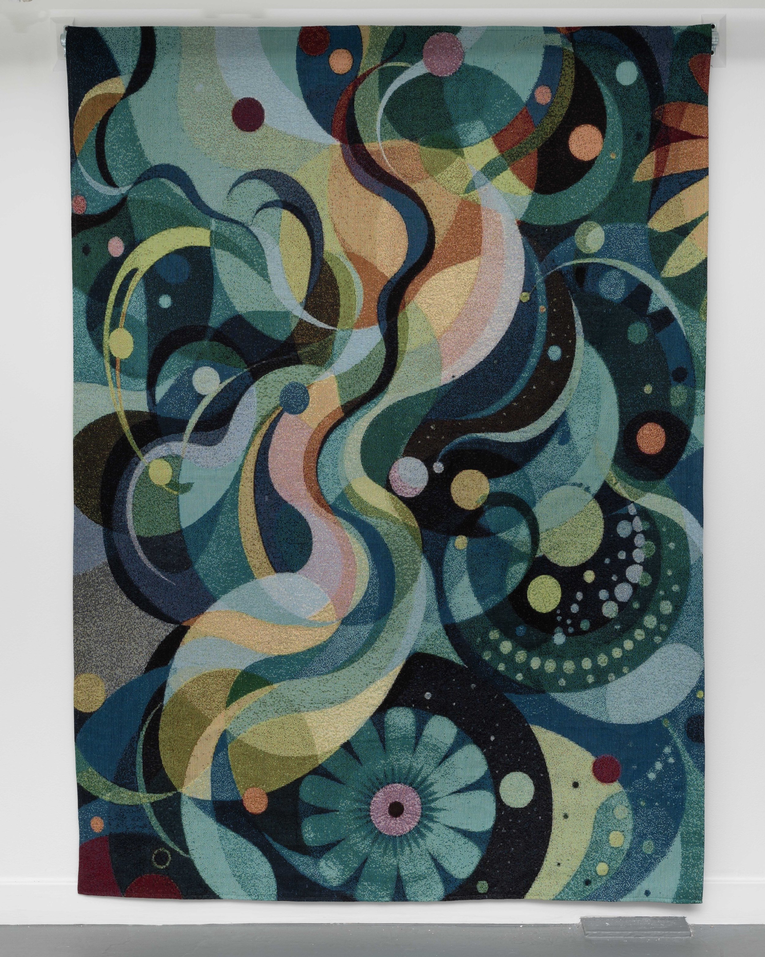 The centerpiece of the exhibition is the large wall-based sculpture AI and the Anvil, in which small, intricate waves ripple across a vast metal surface. With this work, Reben explores the realm of directly converting language into tangible sculpture. Using the giant metal-forming robots of Machina Labs, Reben iteratively collaborates with an AI that autonomously generates code that creates generative 3D sculptures as instructions for massive robotic systems. This enables the robots to sculpt sheet metal into artworks with remarkable precision in a way impossible with other fabrication methods. Reben describes the performative nature of the sculpture’s making as akin to a high-pressure tango, where each machine must move in precisely the opposite direction of the other to balance the immense forces required to manipulate metal. This poetic movement not only reflects the intricacies of their physical interaction but also embodies the delicate dance of creation itself.