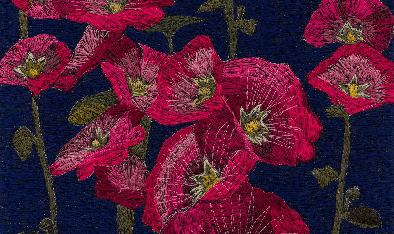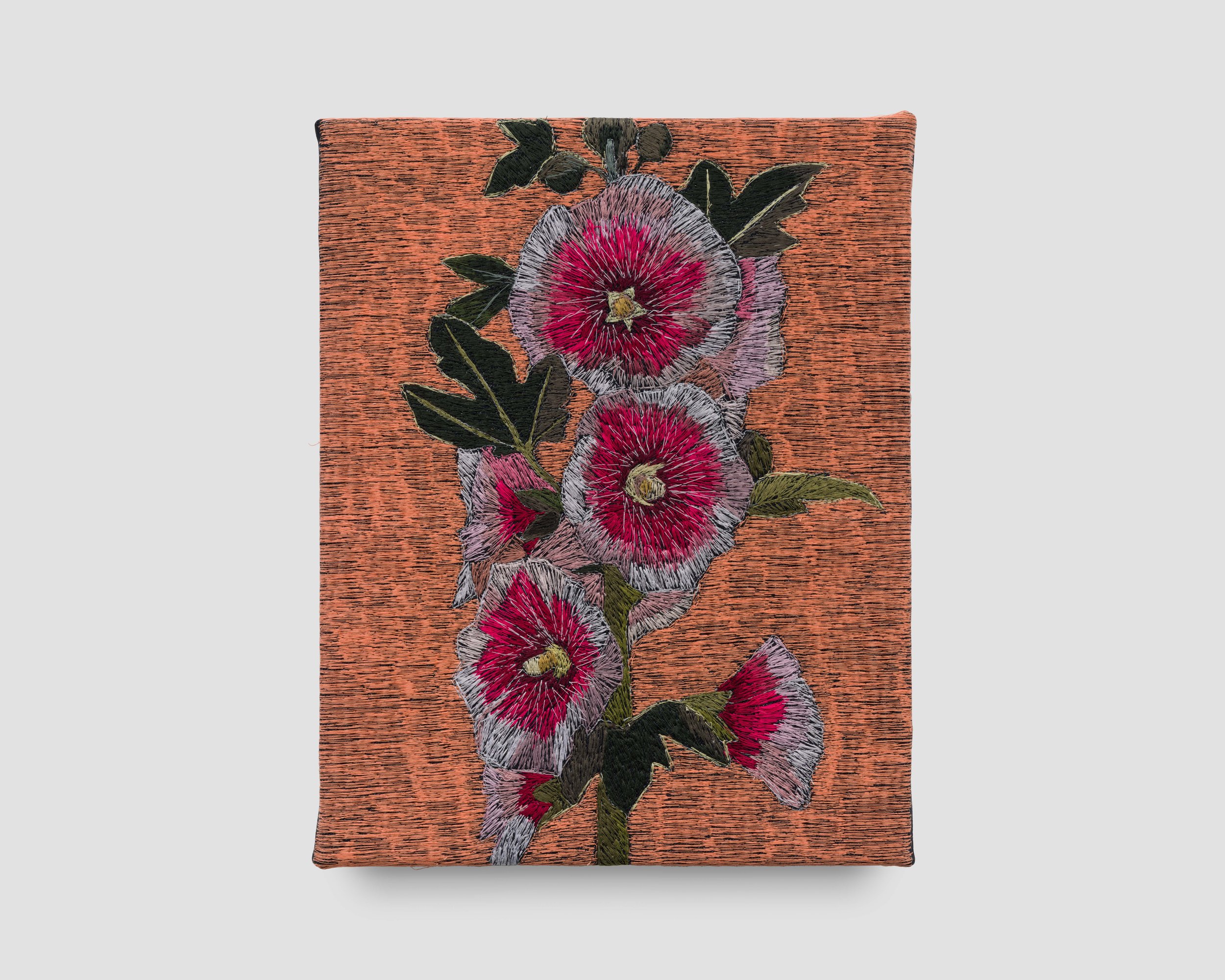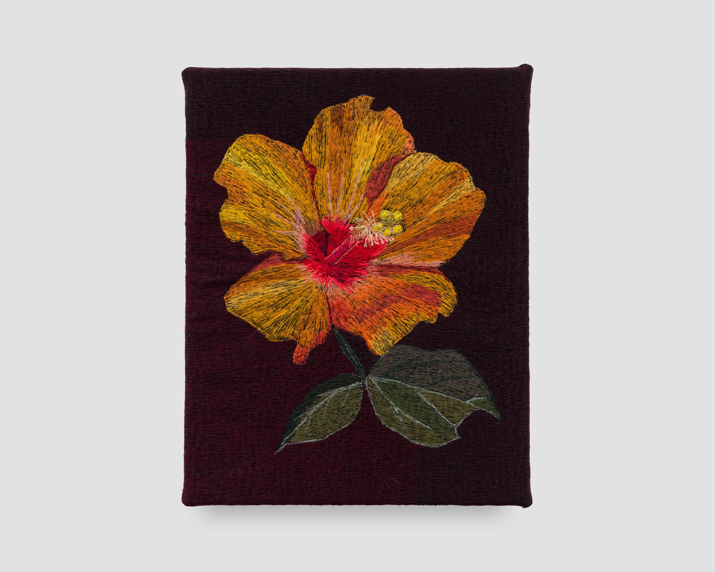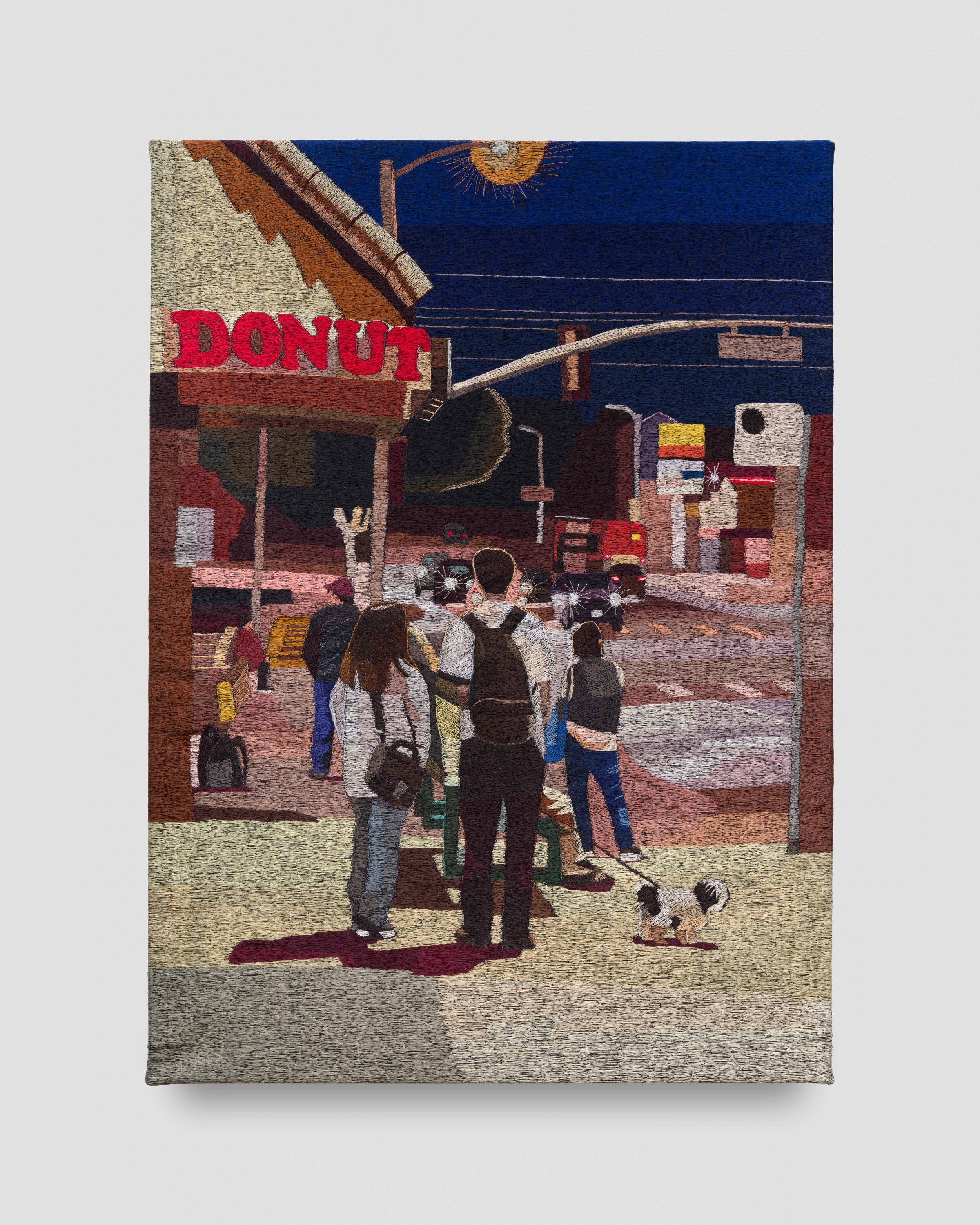 Above all, Medel’s subject is the vibrant street-level culture in and around his studio. His compositions capture moments encountered in life and tenderly rendered in polyester and thread. A series of small works feature the flora and fauna of his Boyle Heights neighborhood – the hibiscus and hollyhocks that dot front yards and curbsides; feisty chihuahuas, proud backyard roosters, and fluffy street cats. His superb sense of color and shading is most on display in these works, whose close-up view allows for subtleties of tone and shadow. This is all the more impressive considering that for these works color is mixed only in the eye; each thread’s distinct hue stands apart yet visually blends into the wider whole. The resulting images appear soft when viewed from a distance, but up close vibrate with expressive visual energy.