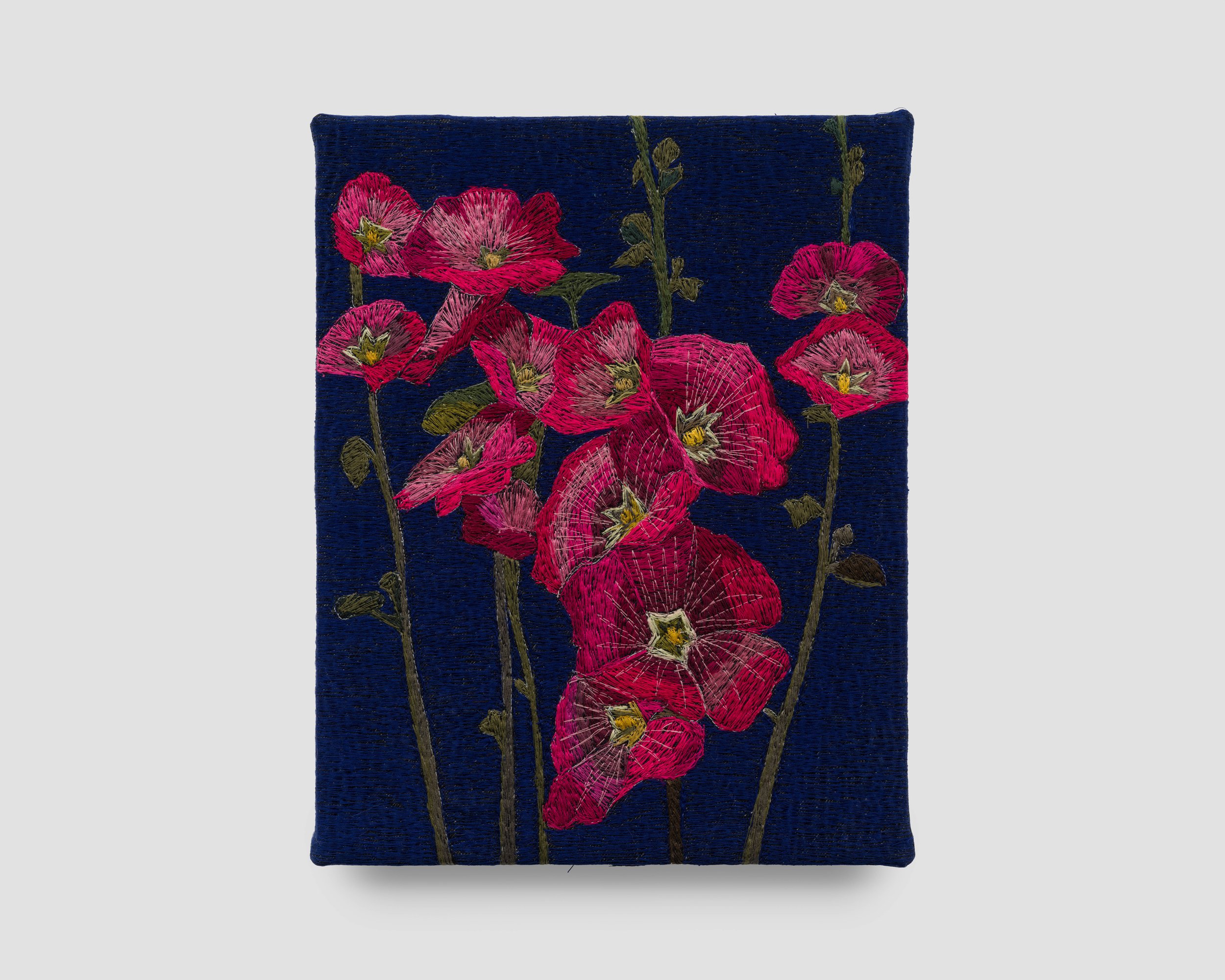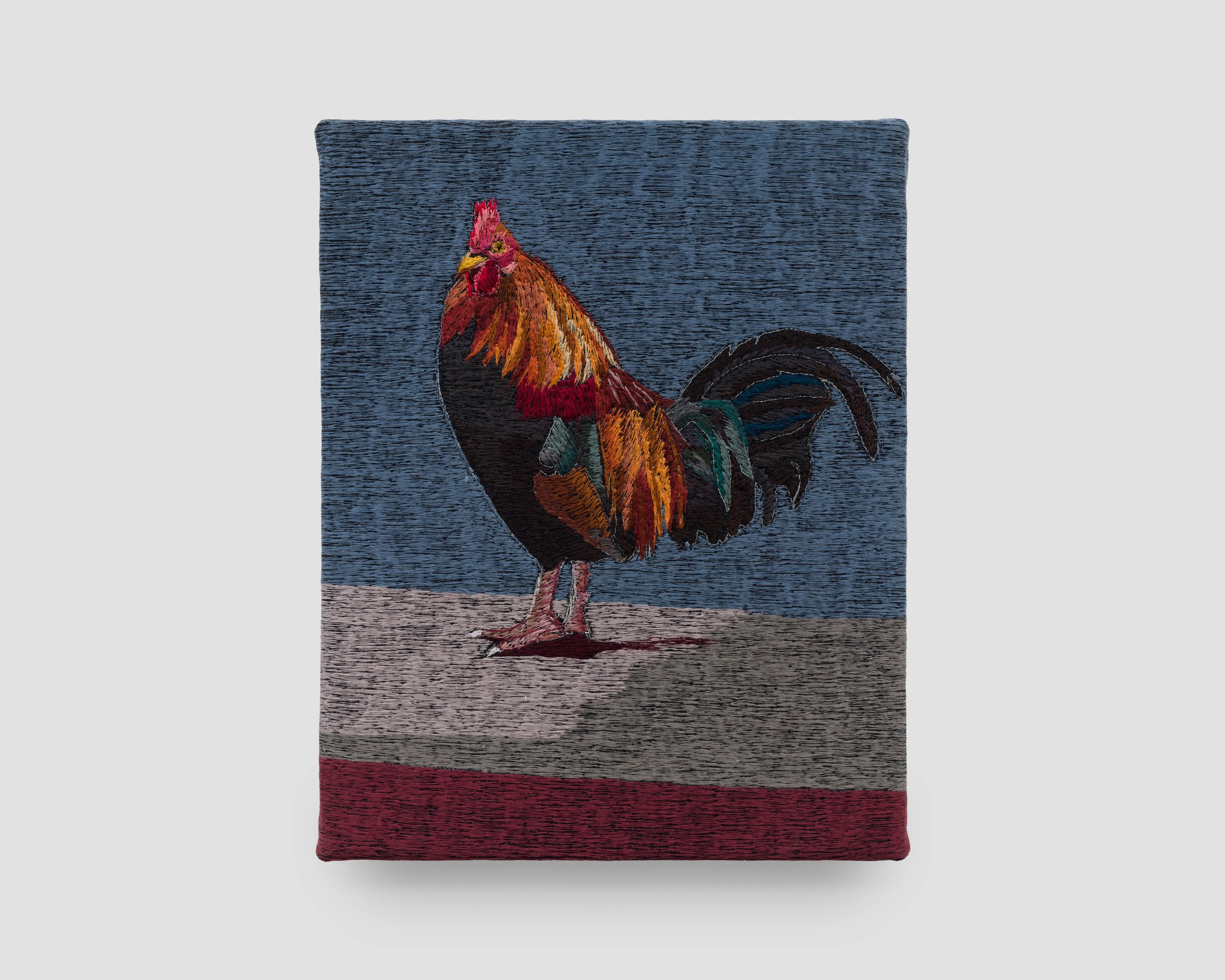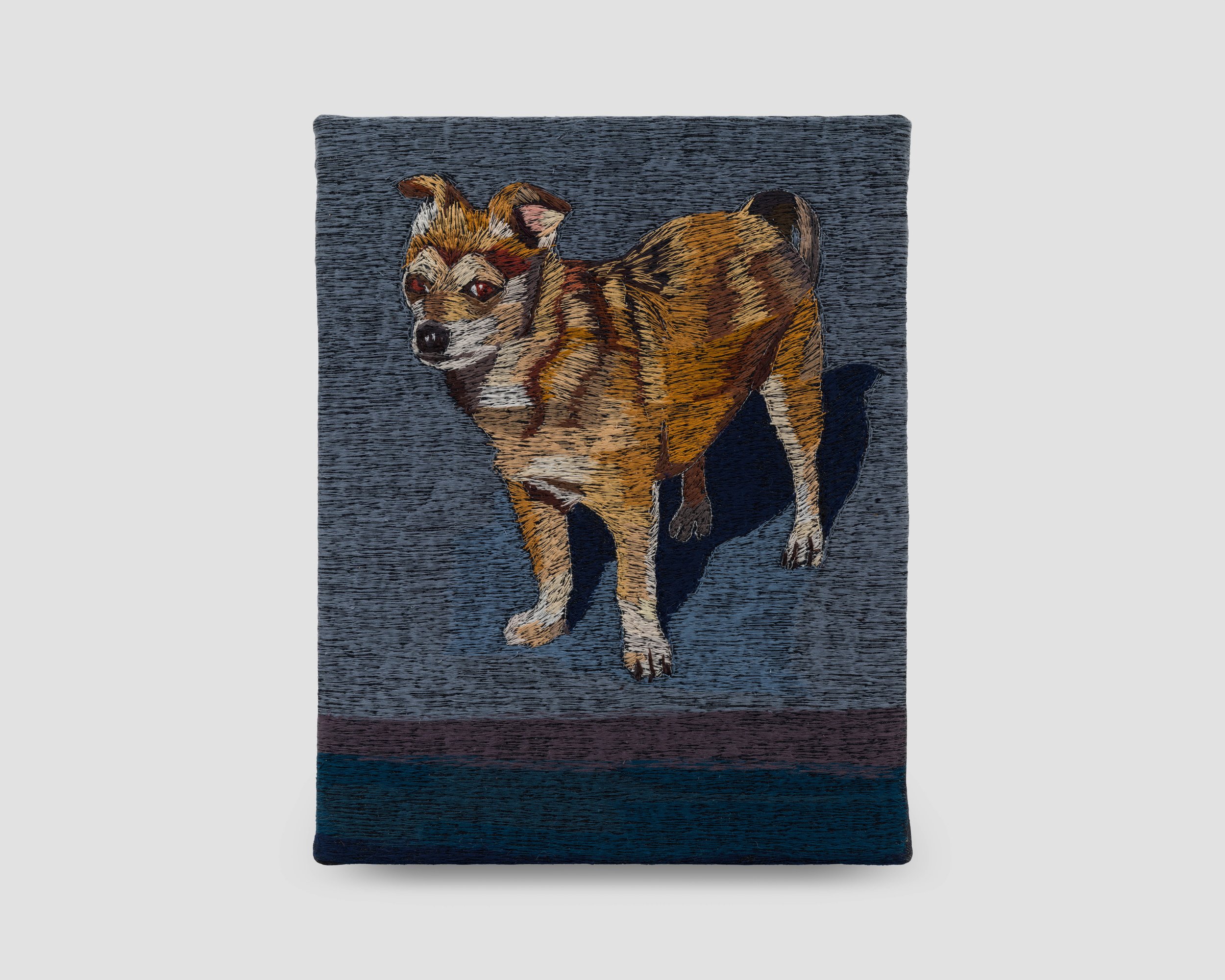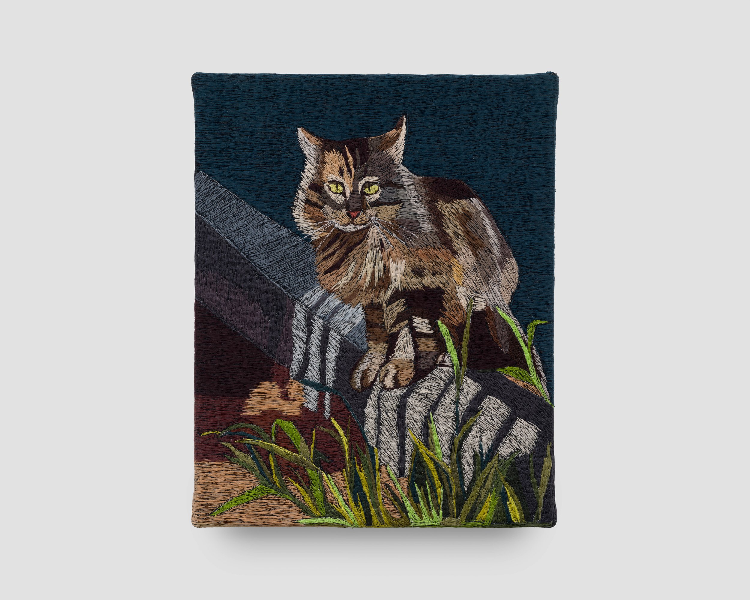 Medel’s medium is fiber – he “paints” with a sewing machine on dark, heavy gauge denim, intuitively selecting color from a wall-sized bank of threads. The deep denim support enhances color by contrast, lending Medel’s compositions a quiet luminosity. Denim also brings to the work its long association with labor and its origins as a sturdy fabric developed to protect the bodies of workers. More personally, denim recalls the protective wear used by the artist’s father in his work as a gardener. Denim provides a strong base for many layers of stitching, which lend depth and shading to the compositions – most apparent here in his portraits of the neighborhood’s animal denizens. This body of work also finds Medel experimenting with abstraction, transforming backgrounds into blocks of solid color that lock together like puzzle pieces. This development grew out of a deepening interest in the history of abstract figuration by artists such as Alice Neel and Noah Davis.