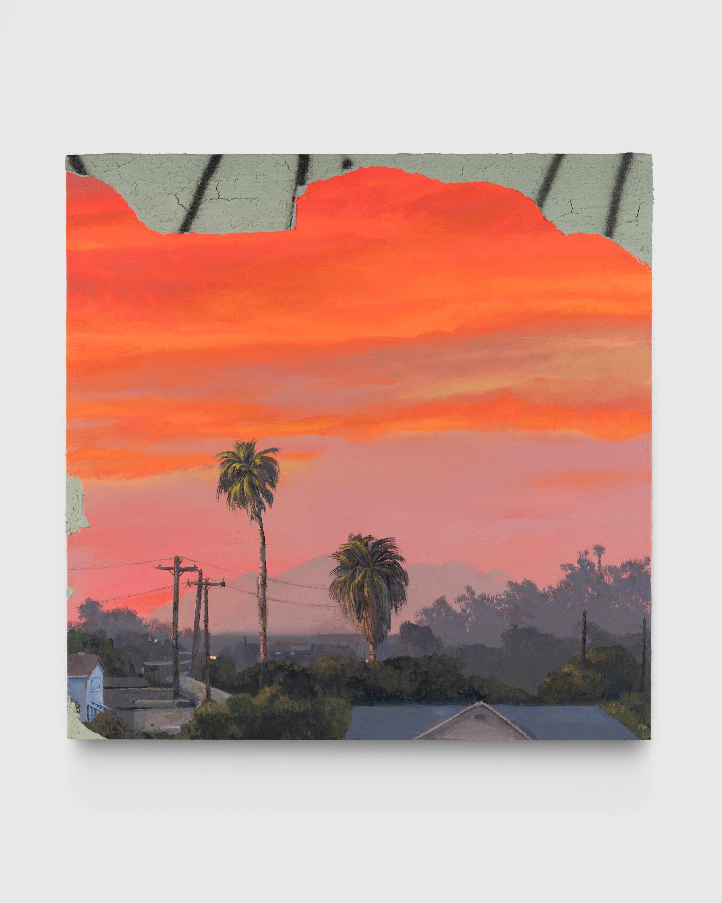 Charlie James Gallery is proud to present LA Te Quiero - a group exhibition of gallery artists engaging with the LA landscape. Anchored by Patrick Martinez’s prescient recent series of paintings titled City on Fire, the exhibition engages the urban landscape of LA, its people, history, beauty and vulnerability. Flanking Patrick Martinez’s City on Fire paintings are two landscape paintings by Danie Cansino, each depicting elements of the East LA landscape captured at sunset. Elmer Guevara’s portraits of memory, specifically family memories of life growing up in South Central Los Angeles border Erick Medel’s thread paintings depicting scenes from contemporary Boyle Heights. Further animating the sense of the people of the city are Shizu Saldamando’s loving portraits of LA creatives Waylon Allison and Gabriela Ruiz. Luke Butler’s Location paintings depict period landscapes of Los Angeles taken from old television programs and adjoin Manuel López’s Hockney-esque portrait of the Westlake neighborhood of Los Angeles. Ozzie Juarez’s Te Quiero piece executed on paper mounted to fabricated metal gate is itself an emblem of the city and its resilience.