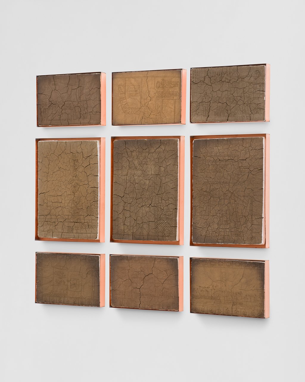 In Black Gold (2024), a smaller, nine-panel soil painting, Amézquita investigates our built environment, specifically California’s history of hiding urban oil derriks behind faux architecture. While documenting the often-concealed blight of urban drilling and the oil companies who profit off of polluting minority communities, Amézquita also celebrates the change that can come from protest and community organizing. The work is meant to be read in registers, the three rows representing past, present, and future, with organizers at the top pushing for an end to harmful practices. The panels are framed in copper, a metal with healing properties in traditional practice, alluding to a needed healing of both land and community.