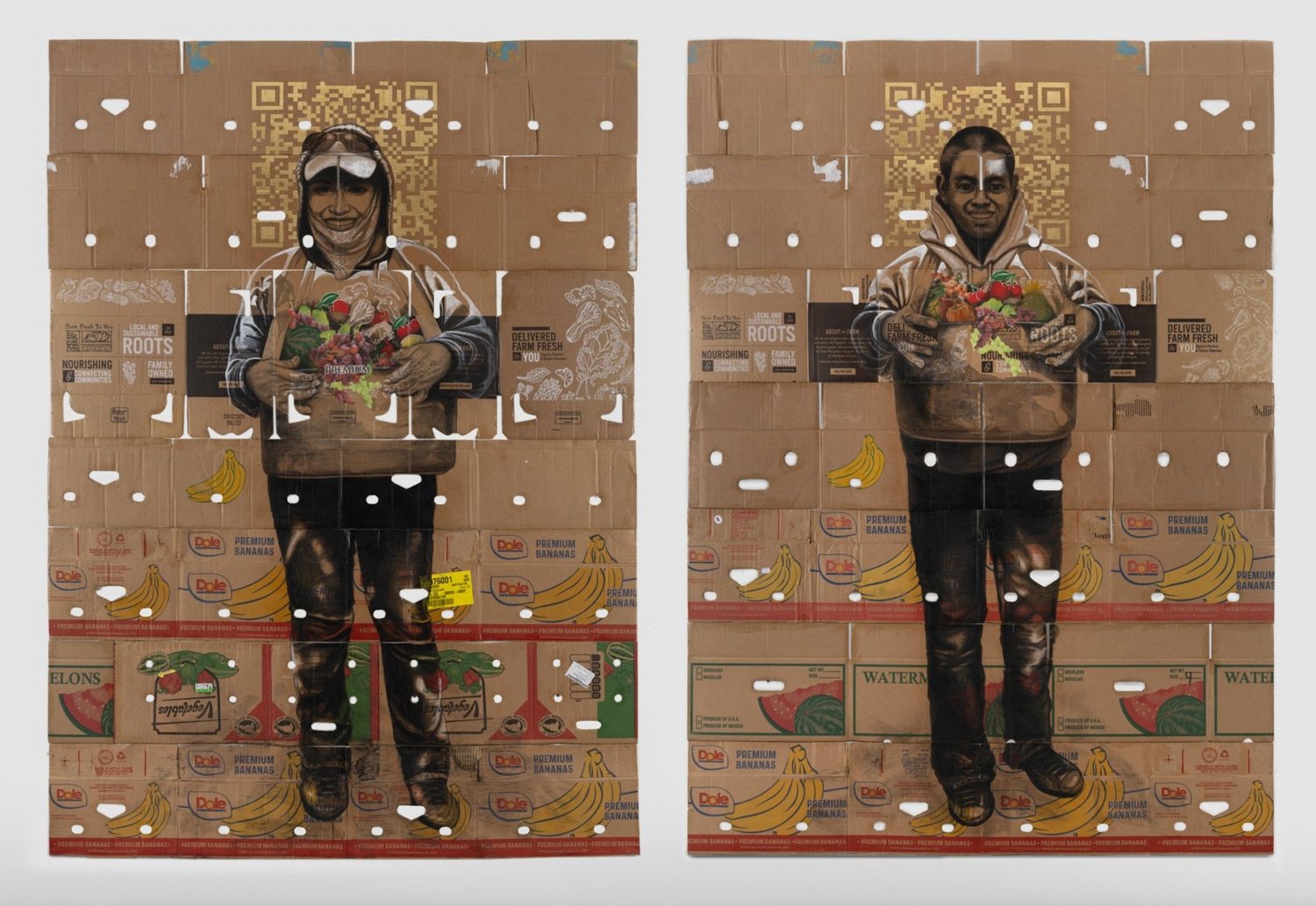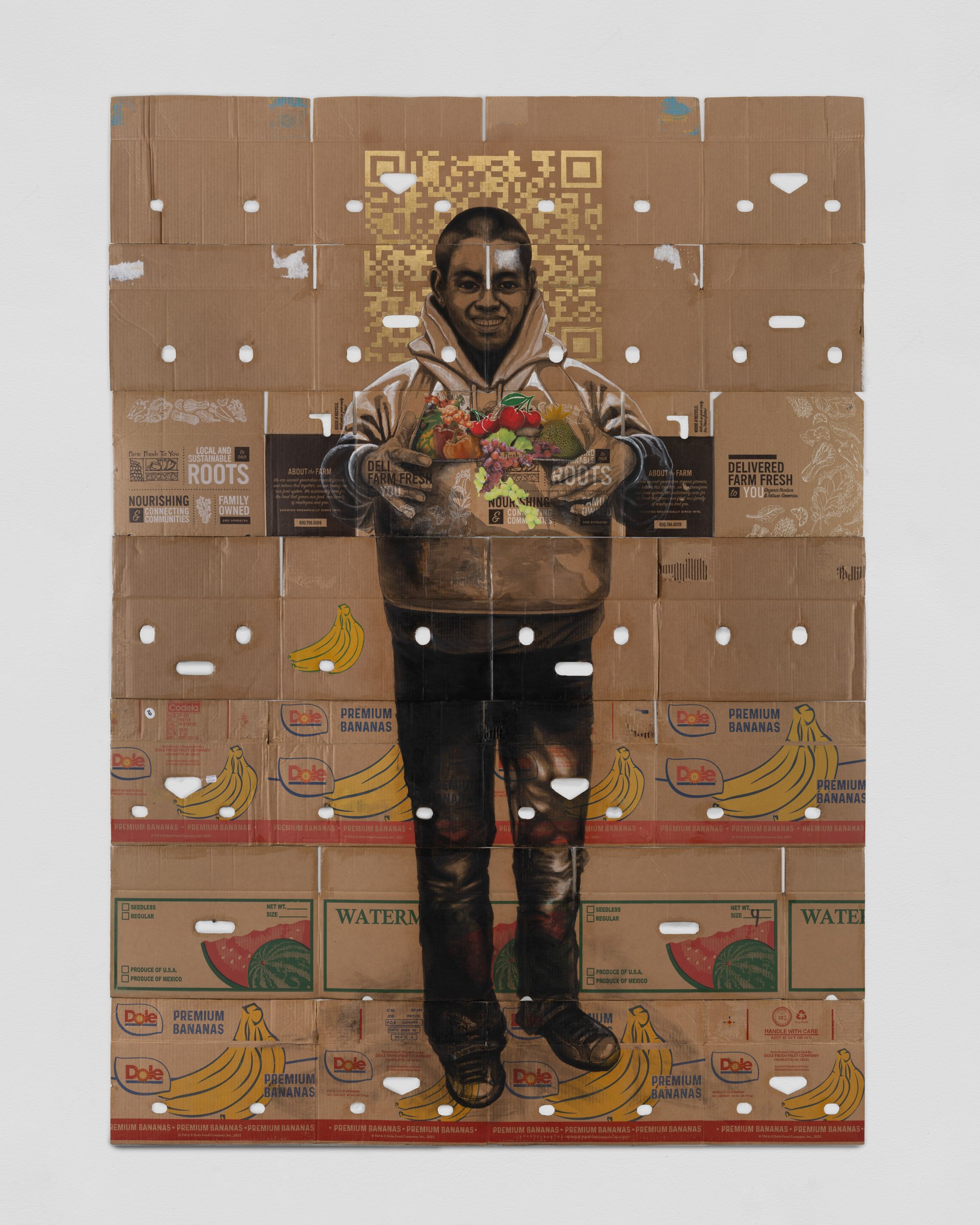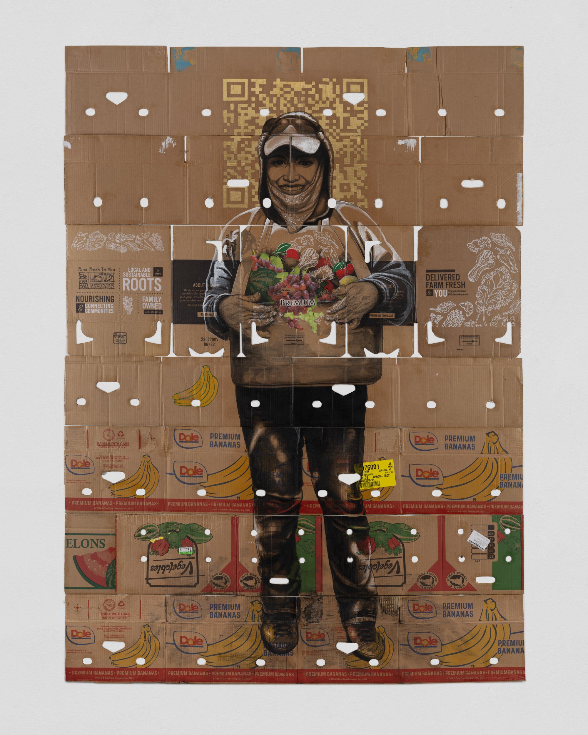 The gallery’s booth will be anchored by a pair of large scale pieces - Essential Since 2013 and Essential Since 2004 - two large scale portraits of farmworkers executed on a series of found produce boxes. Each piece presents a portrait of an individual farmworker, one female and one male, each in poses suggestive of a cross. Each piece measures approximately 8 x 6 ft in dimension. In gold leaf at the top of each portrait are fragments of QR codes taken from the subjects' ID cards, used in the fields by “checkers” who measure and track the harvests for each worker. Flanking these works are several portraits of farmworkers at work and at rest on found produce boxes. Narsiso is currently exhibiting at the CONVERGE Biennial in Portland, Oregon. In December of 2023, Narsiso will be the subject of a solo exhibition at the Buffalo AKG Museum (formerly the Albright-Knox) which will run until April of 2024.