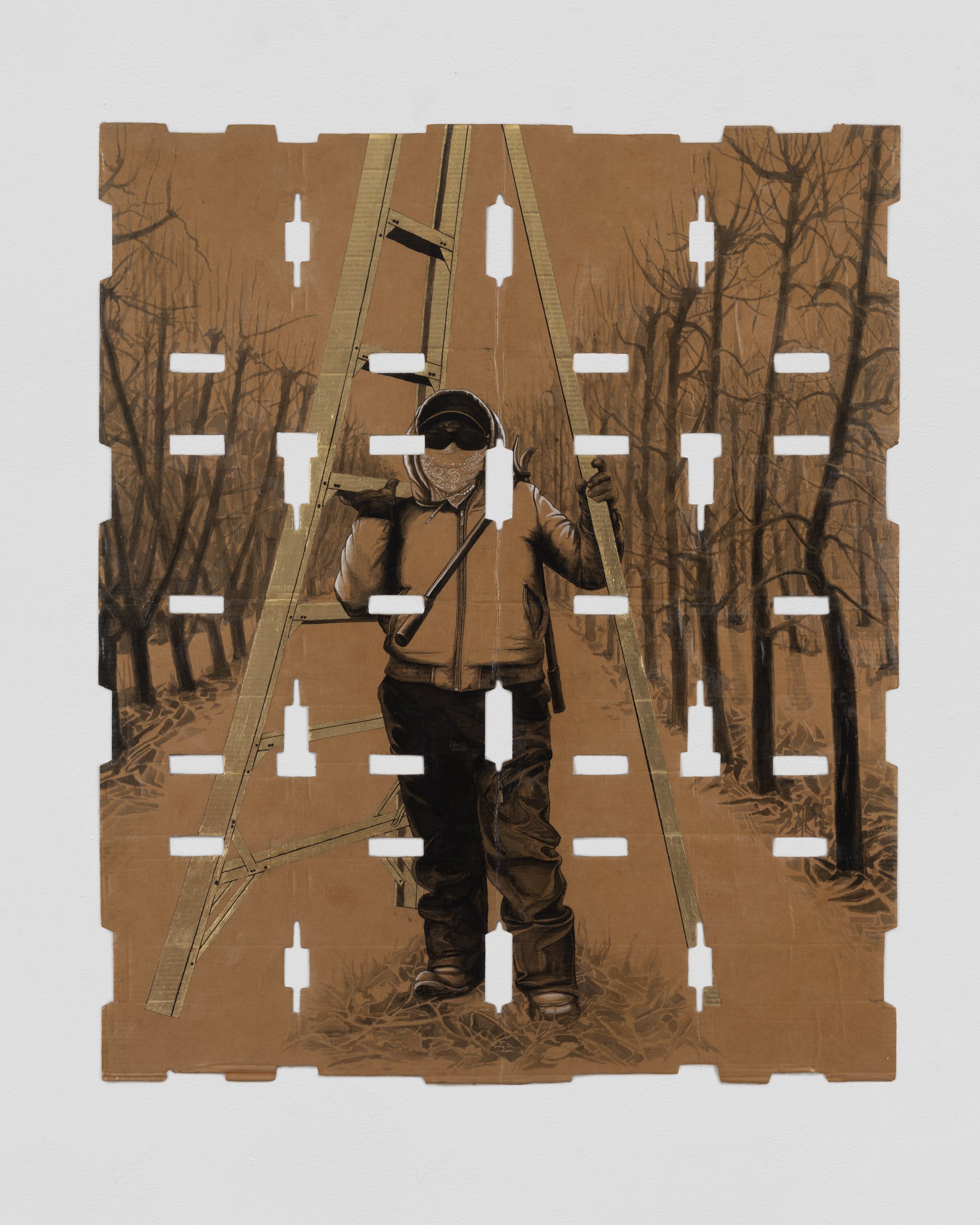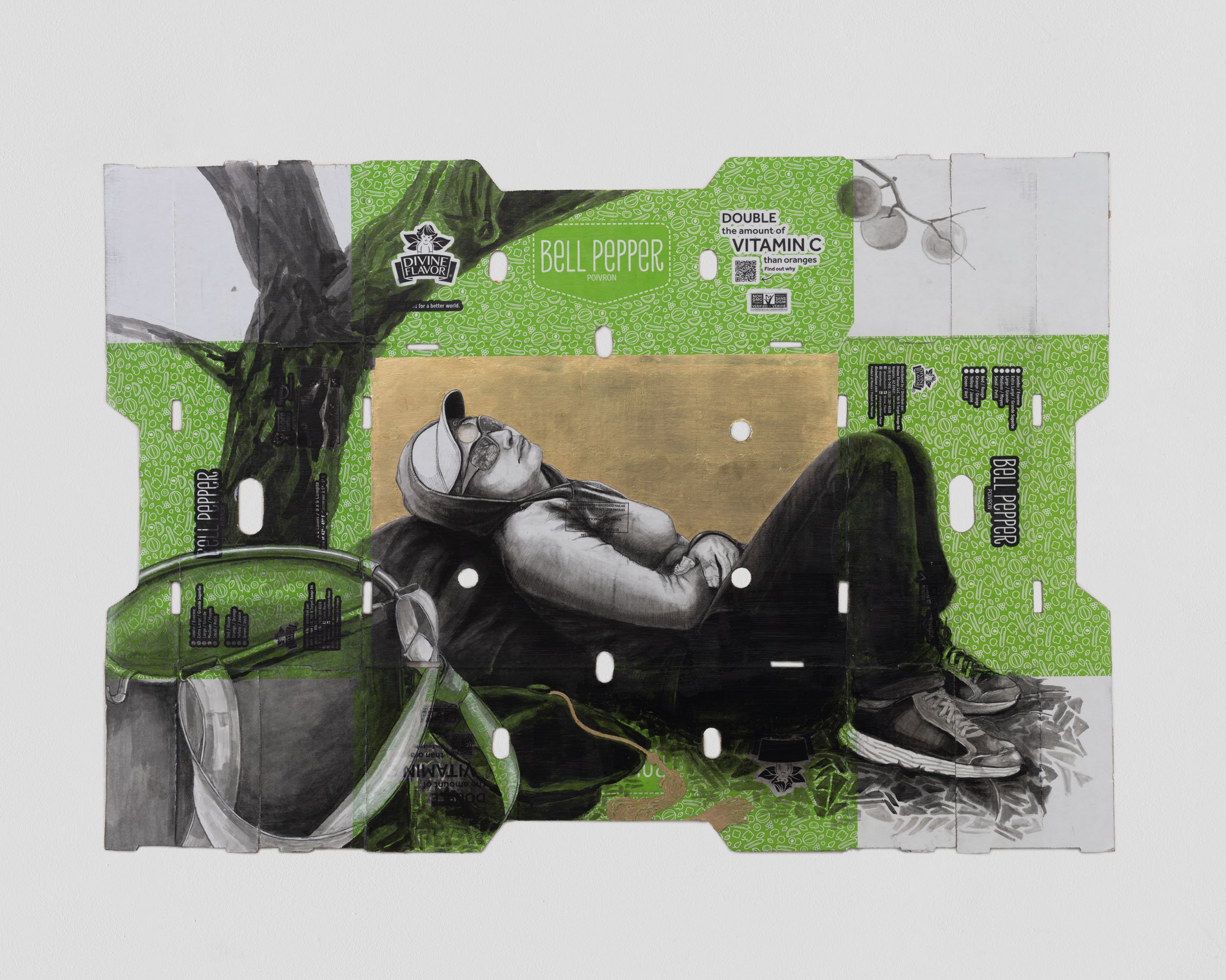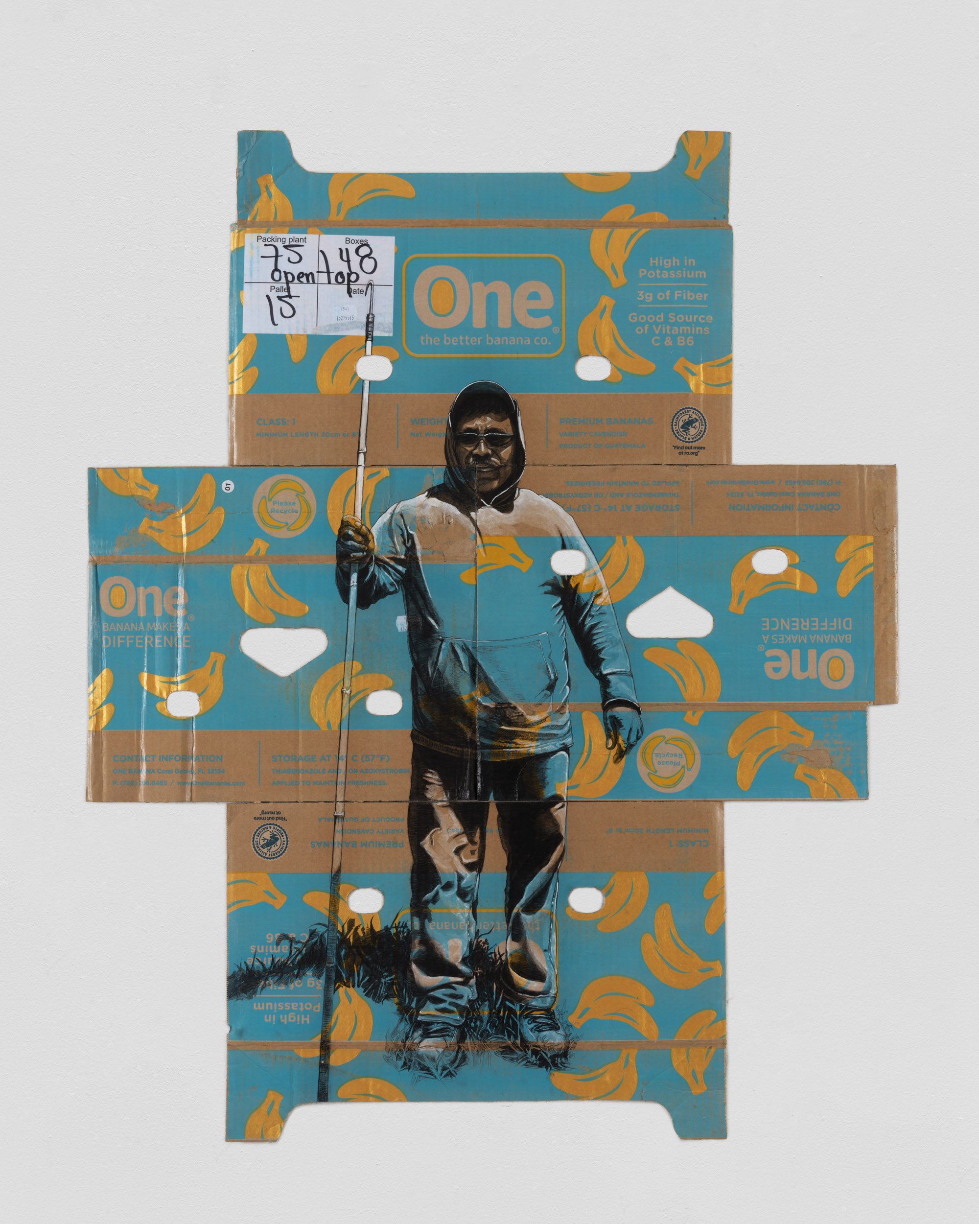 The gallery’s booth will be anchored by a pair of large scale pieces - Essential Since 2013 and Essential Since 2004 - two large scale portraits of farmworkers executed on a series of found produce boxes. Each piece presents a portrait of an individual farmworker, one female and one male, each in poses suggestive of a cross. Each piece measures approximately 8 x 6 ft in dimension. In gold leaf at the top of each portrait are fragments of QR codes taken from the subjects' ID cards, used in the fields by “checkers” who measure and track the harvests for each worker. Flanking these works are several portraits of farmworkers at work and at rest on found produce boxes. Narsiso is currently exhibiting at the CONVERGE Biennial in Portland, Oregon. In December of 2023, Narsiso will be the subject of a solo exhibition at the Buffalo AKG Museum (formerly the Albright-Knox) which will run until April of 2024.
