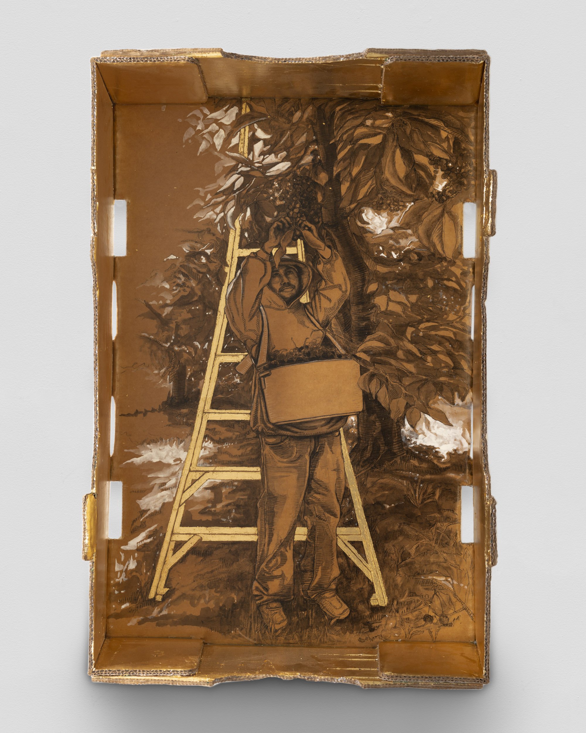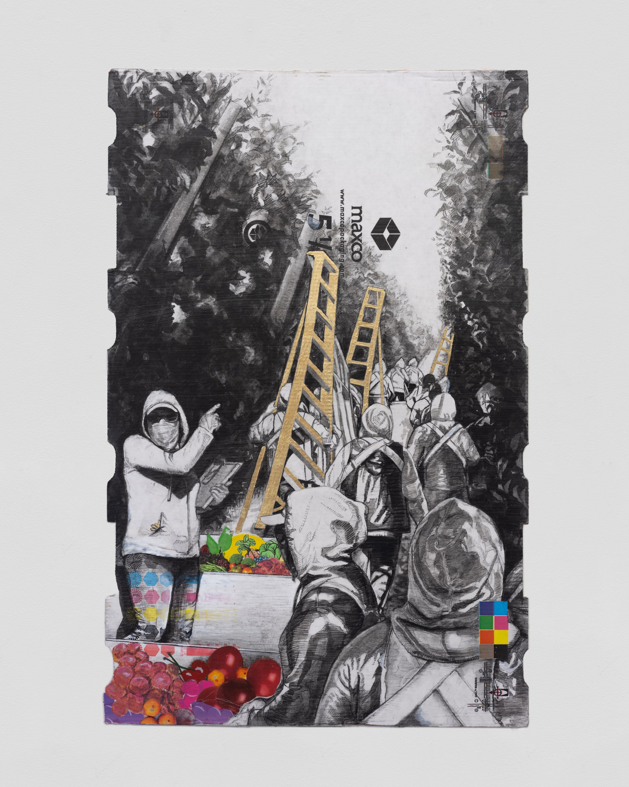 Charlie James Gallery is delighted to present a solo exhibition of new works by gallery artist Narsiso Martinez for the 2023 edition of The Armory Show from September 8-10, 2023. This is the first solo presentation of works by Narsiso in New York City. Narsiso Martinez’s drawings and mixed media installations include multi-figure compositions set amidst agricultural landscapes. Drawn from his own experience as a farmworker, Martinez’s work focuses on the people performing the labors necessary to fill produce sections and restaurant kitchens around the country. Martinez’s portraits of farmworkers are painted, drawn, and expressed in sculpture on discarded produce boxes collected from grocery stores. In a style informed by 1930s-era Social Realism and heightened through use of found materials, Martinez makes visible the difficult labor and onerous conditions of the “American farmworker,” itself a compromised piece of language owing to the industry’s conspicuous use of undocumented workers.
