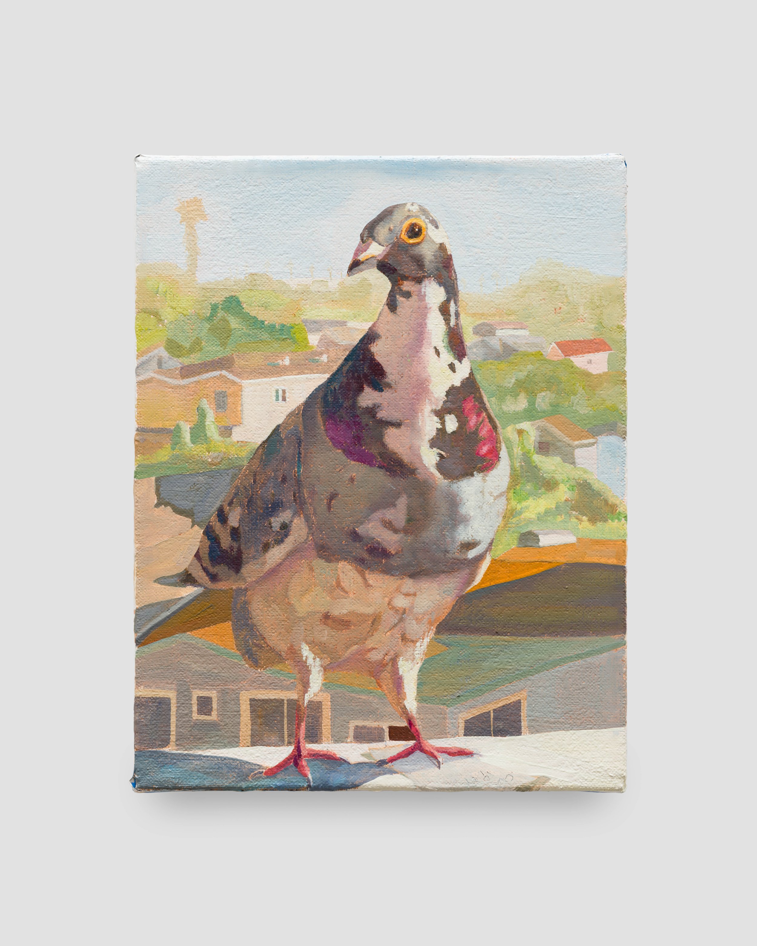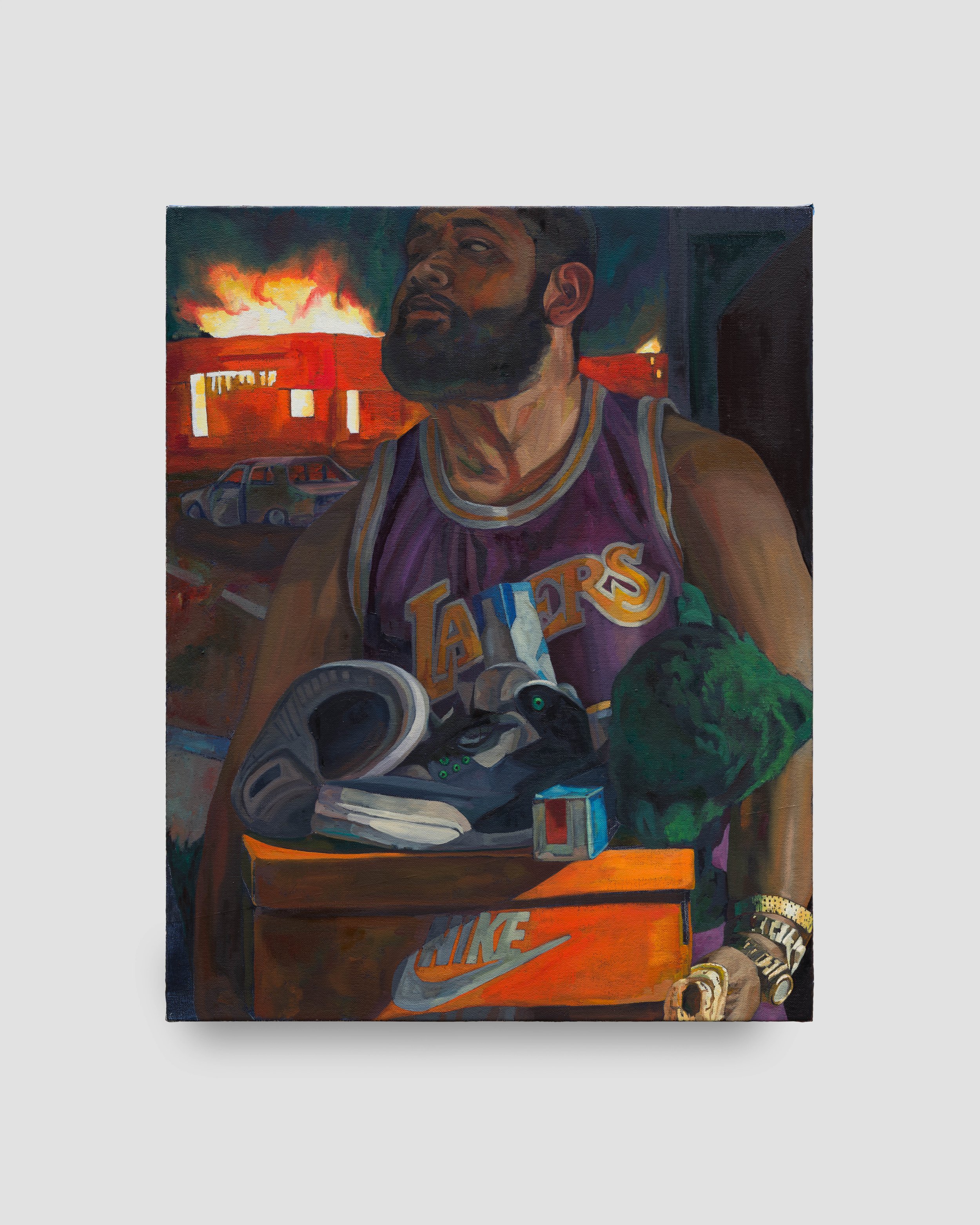 Guevara often riffs on art historical precedent, posing his contemporary figures as Renaissance nobles and saints. The large self-portrait Couple Hours after 3:15pm mirrors the figure of the 17th-century painting Portrait of a Man with a Sheet of Music from the Getty Museum collection. The classical setting has been swapped for a Los Angeles sidewalk, where the figure sits holding a newspaper announcing the beating of Rodney King. The scene appears placid at first, but the violent headline is echoed in the painting’s title – referencing the time at which the officers’ acquittal was announced – and the flames that erupt in the far distance. The contrast between the sunny California scene and the eminent violence glimpsed behind builds a tension that plays out across the exhibition.