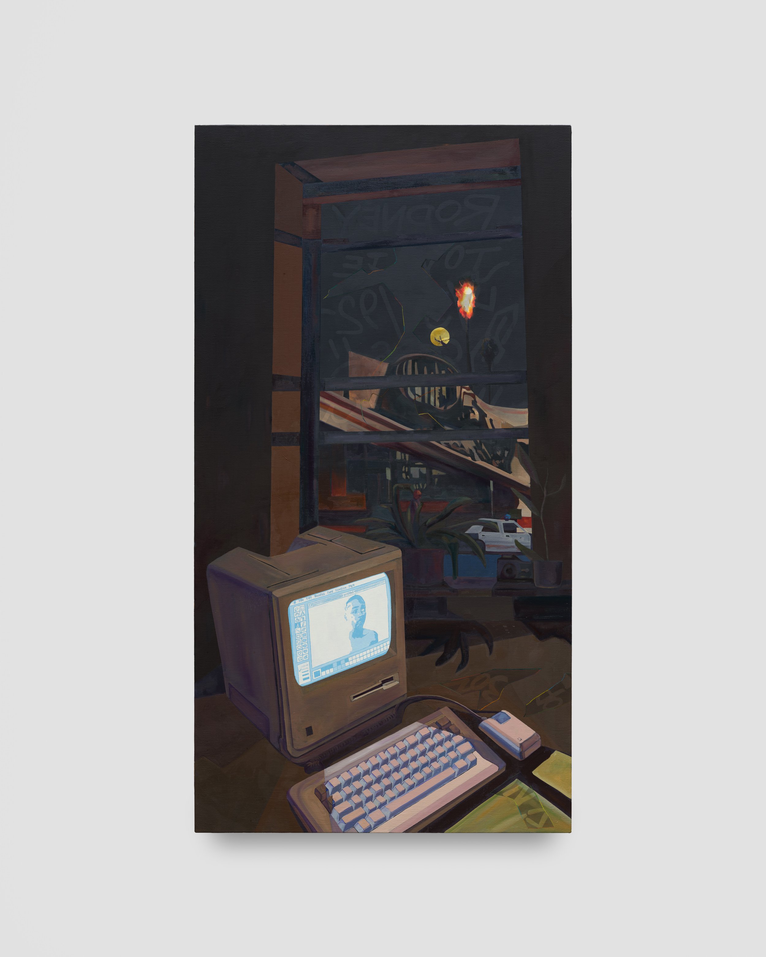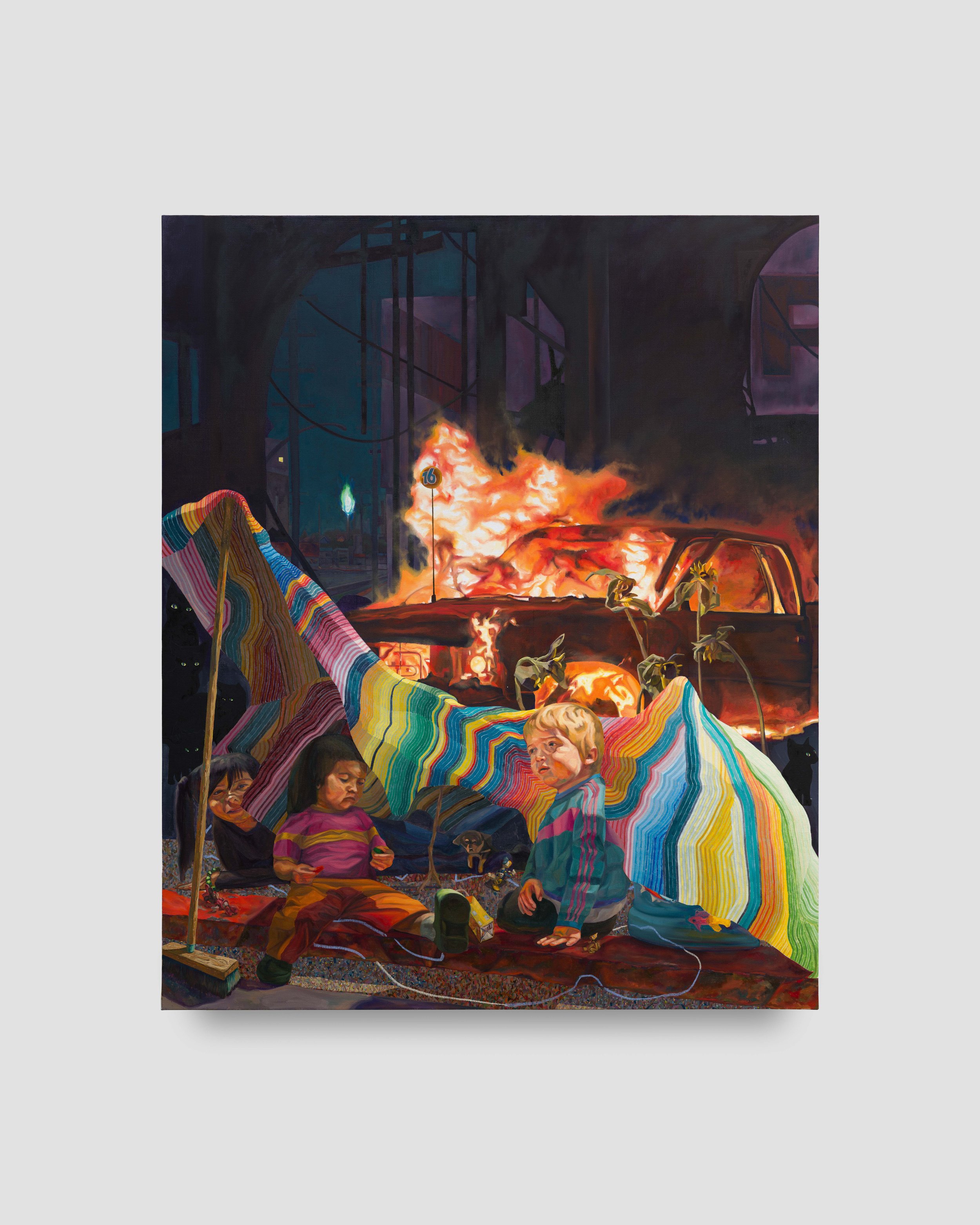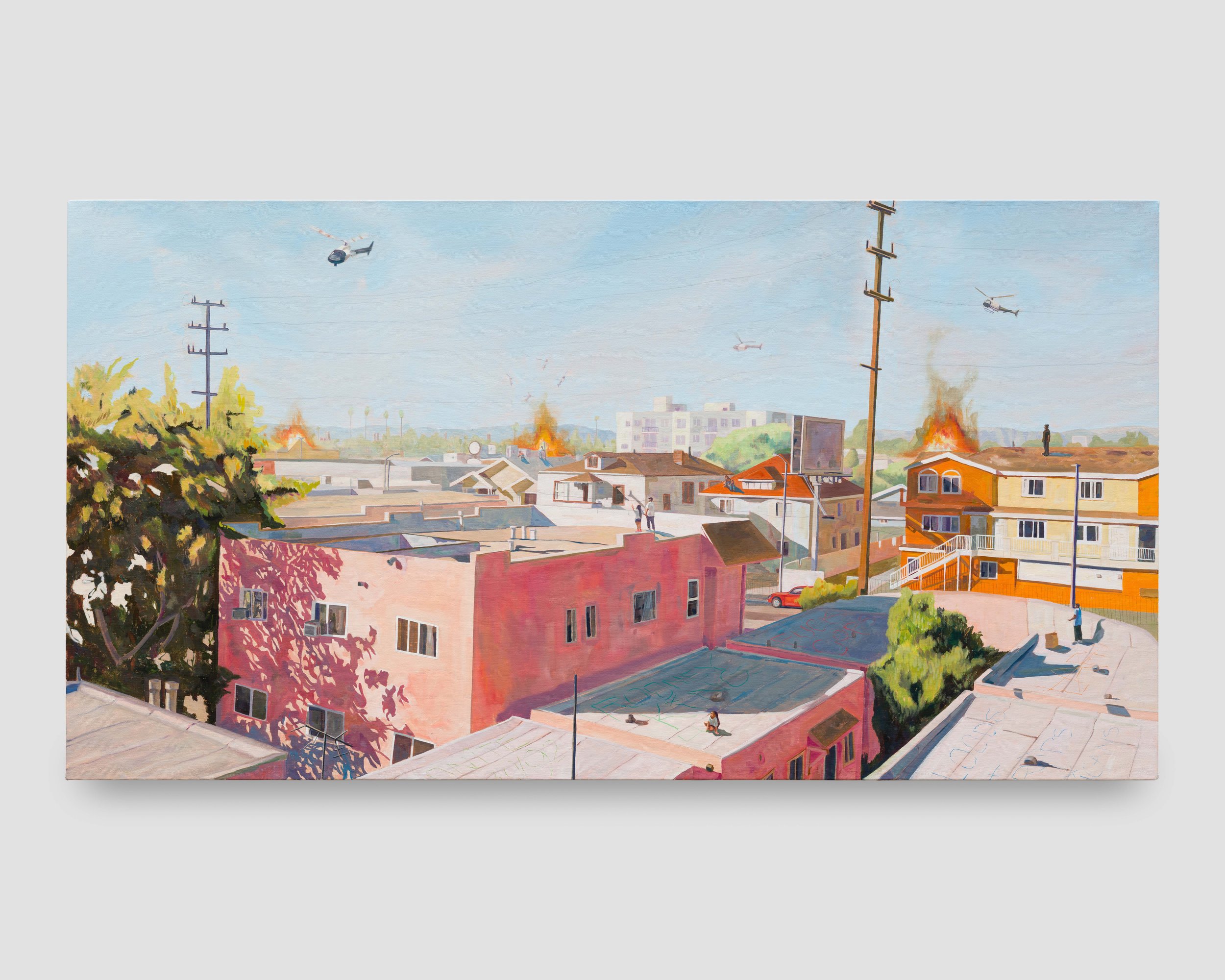 Charlie James Gallery is proud to present Elmer Guevara: Yesterday like today / Ayer cómo hoy, the artist’s second solo exhibition with the gallery. In this new body of work, Guevara explores ideas of intergenerational memory and trauma, reflecting on his own family’s experience of civil war and unrest across time and space. The paintings meditate on the 1992 Los Angeles Uprising, which tore through South Central near where the Guevara family settled after fleeing violence in El Salvador. Time folds in on itself in these paintings, layering the civil war, which predated the artist’s birth, on top of the chaotic experiences of 1992, while also gesturing to the natural disasters and political unrest of the present moment. Despite his heavy subjects, Guevara never loses sight of the personal stories of regular people working to make a life in tumultuous times.